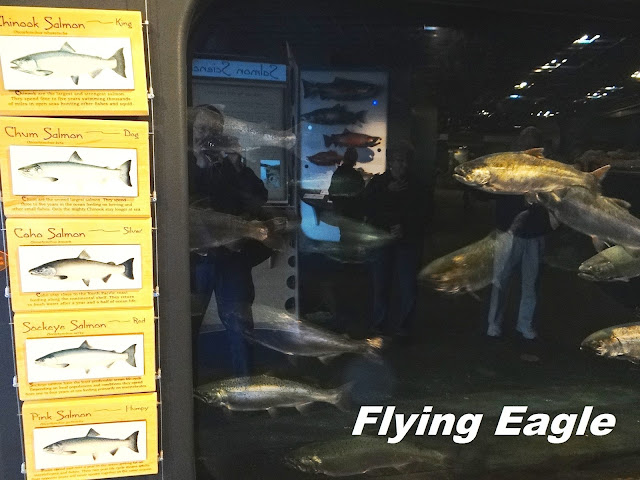 一進門就看到一個很大的水族箱,裡面有著形形色色的鮭魚。玻璃橱窗上貼著太平洋西北部五種鮭魚的圖文介紹,不由得讓我們想起沿路向導遊學來的本領,也就是用五隻手指記得這些鮭魚的名字和暱稱。