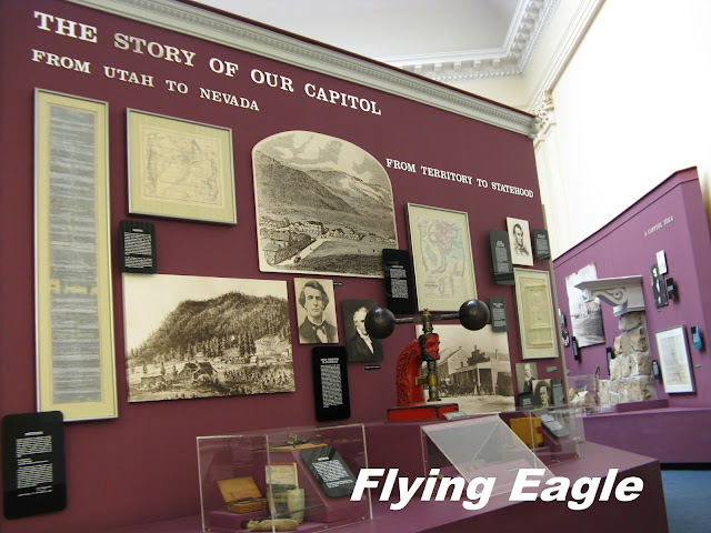卡森城雖是首府所在,但依人口計算卻只是內華達州第10大城市,僅有5萬多人。我們到訪時雖是星期天的下午,但州府仍然開放,據說它是全年無休的,這和許多其他州府有所不同。有時我們在週日到訪其他州政府,往往不得其門而入,只能觀賞建築物本身及周遭環境。這天在卡森城州府沒有什麼遊客,我們便好整以暇地拍照,而且瀏覽州府大樓裡面附設的博物館。博物館裡當然少不了內華達州的歷史以及一些年代久遠的展覽品。
