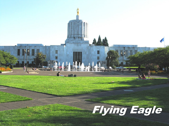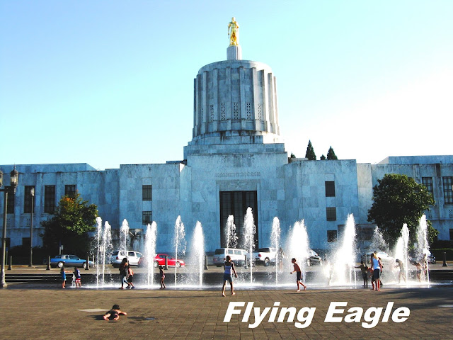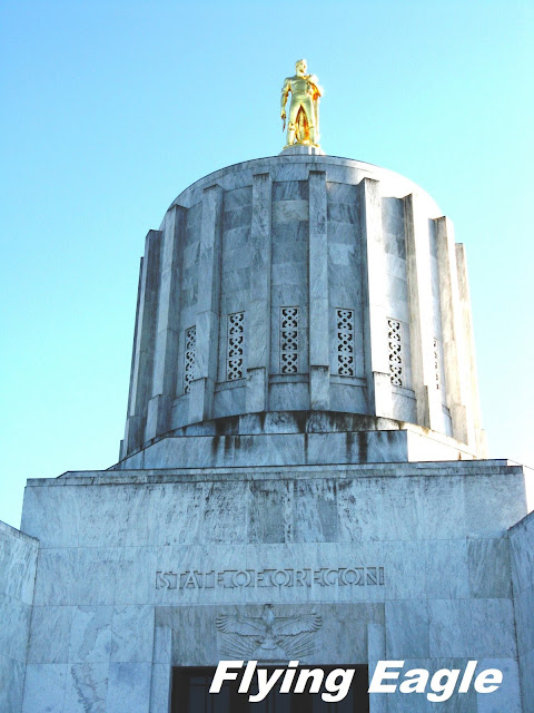 我們到訪的那天不巧是星期天,州府不開門,所以只能在外頭照幾張相片。遠遠便可望到州府前面的廣場頗為空曠,除了綠草如茵之外,還有水柱從地上噴出。有些孩童在炎炎夏日中戲水,消消暑氣。正門口的外面有著藝術浮雕,浮雕裡有輛篷車旁邊站著一匹馬和一家三口,用以紀念早期到西部拓荒的先民。州府的最頂端有個小金人,叫做「奧勒岡先驅」。它是銅製的雕像,裹以23K金的外層,同樣也是紀念來奧勒岡的拓荒者,據說奧勒岡州居民一開始對這個小金人頗有意見,遲遲無法接受。