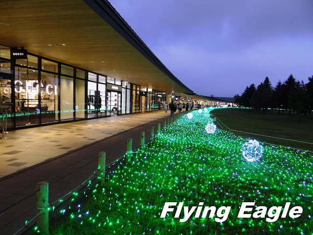 之後我們搭乘星野度假區的免費穿梭巴士,回到輕井澤站。意外發現月台的一側有個為孩童而設的「森林的小松鼠 Kids Station」,頗具童趣。我們未多佇足,逕赴王子購物廣場。廣場佔地不小,有綠樹草地和人造湖,環境優於美國的outlet mall。入夜後地面亮起燈光,夜景猶勝傍晚。