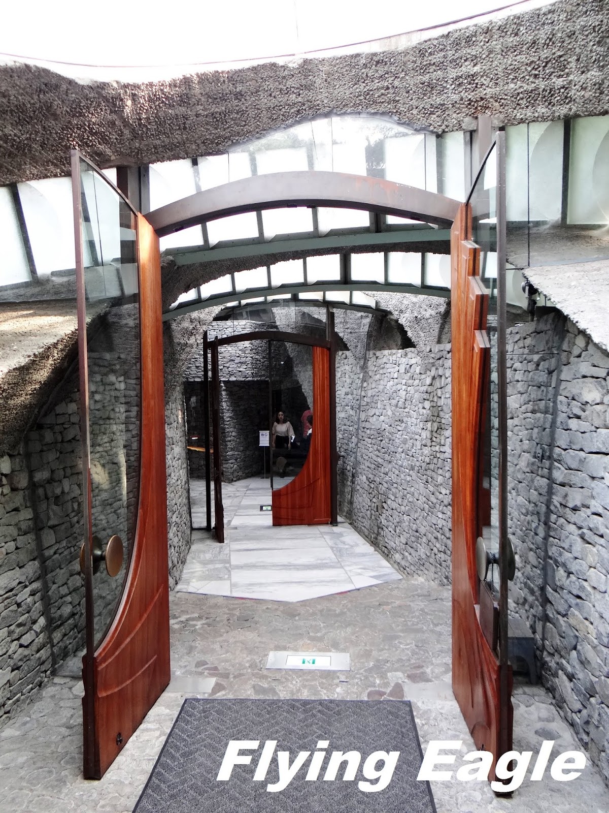 教堂以一道道的弧形石頭為頂,石與石間是玻璃,外觀看來有些像一堆斜擺的老舊唱片。進了教堂,放眼所見仍舊是木、石和玻璃。隨著陽光的投射,堂內呈現不同的光影。教堂內不許拍照,想是為了保持敬拜默想的安靜肅穆。我在前排坐下,看到石階上的主禱文「我們在天上的父,願人都尊祢的名為聖,願祢的國降臨,願祢的旨意行在地上」,十分感動,甚至溼了眼眶。我們參觀過的教堂不計其數,這是頭一次如此,是很特別的經歷。