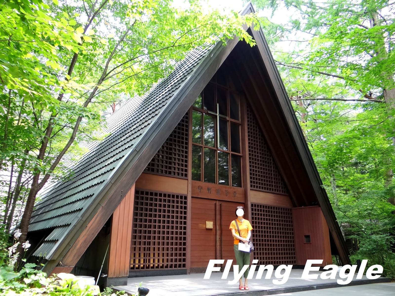 下了巴士不久就看見高原教堂和石之教堂的標示。高原教堂位於樹林之中,素雅的木造建築和大自然十分融合。長長的屋頂幾乎覆蓋到地面,使得建築看來像是個大三角形。大門上方寫著星野遊學堂,這是教堂的前身。早年日本的思想家和文人常在此聚集和論辯。二戰後改建為教堂,但仍保留原來的名字以資紀念。據說這裡是日本第一個讓新娘穿白紗舉行西式婚禮的教堂,頗具意義。