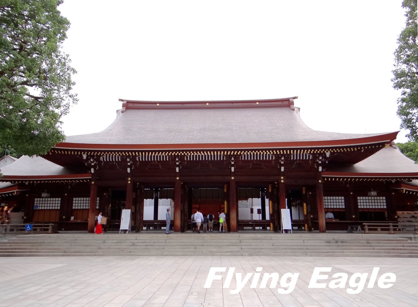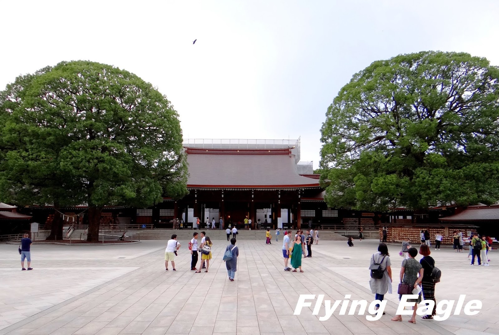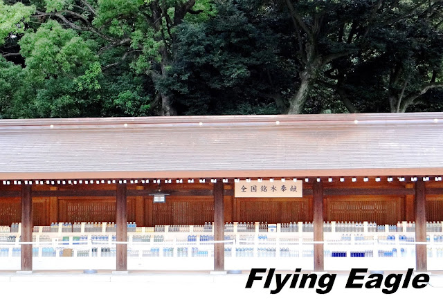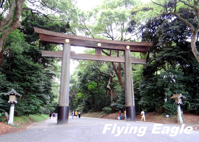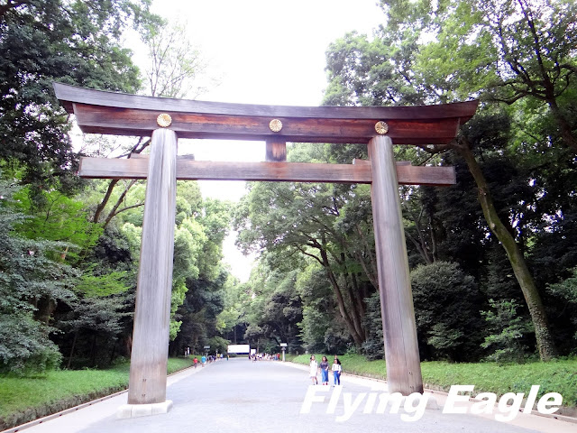 午後我們來到明治神宫,顧名思義,此地和明治天皇有關。明治就任天皇後銳意改革,破舊立新,使日本從封閉的島國搖身變為亞洲的先進國家,史稱明治維新。明治神宫便是供奉明治天皇及其皇后的神社,於1920年啟用,迄今剛好一個世紀。明治神宫也是日本參拜人數最多的神社,舉辦特殊慶典時經常有上百萬人湧入。神宫佔地70公頃,是東京市內數一數二的綠地。共有三條參拜道通往神宫,我們走的是南邊的那條。下了地鐵看見神宮橋,轉個彎即到。網上不少資料特別提到,明治神宫的「宫」兩個口中間沒有一撇相連,是「宮」的古字,意指建築物沒有走廊,後來的建築物有了走廊就多了一撇。有趣的是神宮橋明明是通往明治神宫的橋,用的卻是現代的「宮」。橋上有街頭藝人表演,吸引一些人圍觀。