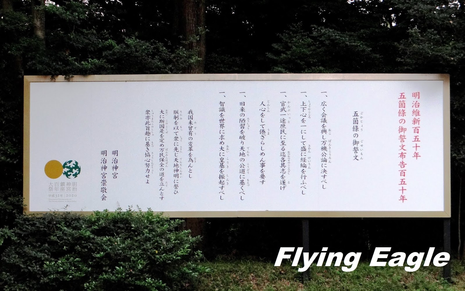 繼續前行是第二個鳥居。1920年的原始鳥居用的是阿里山千年神木,後因雷擊而損壞。如今這個鳥居的原木同樣來自台灣,是丹大山1500年的扁柏。據說這是日本最大的木製鳥居,高12公尺。不過日本很多鳥居都自稱是全國最大,川越冰川神社的還高15公尺呢,不曉得所謂最大是依據什麼標準。鳥居附近有告示牌列出五條御誓文,當年明治天皇親率百官宣誓,誓文包括聆聽民意、百姓得遂心志、破除陋習、吸納世界新知以振國力等。明治在150年前能夠有這樣的體認,無怪乎成為一代明君。