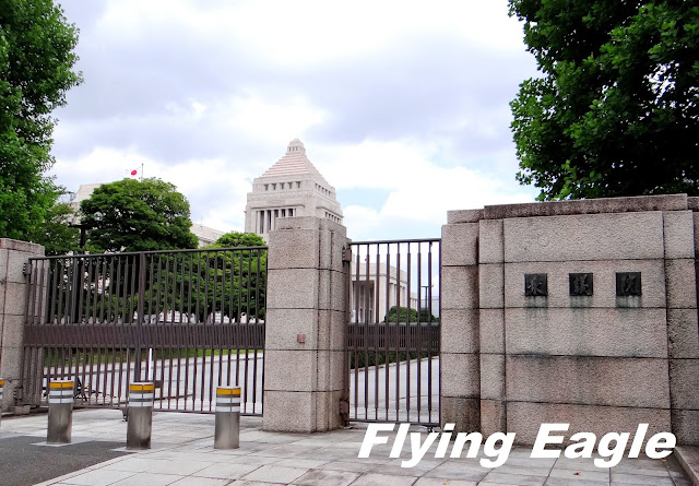 我們多年前到華府時,曾參觀白宮和國會山莊,當時拜登(Joe Biden)還是參議員,正在國會殿堂中侃侃而談。拜登後來做了兩任副總統,如今又以77高齡出馬競選總統。此次日本行既來到首都東京,自然不能錯國會議事堂。國會議事堂位於千代田區,距我們住的東京新大谷飯店步行即達。議事堂完工於1936年,電影和漫畫常用它來象徵日本。我們安步當車,先行經側門。不巧開放參觀的時間我們另有安排,便只能瀏覽外觀。繞到正面,覺得似曾相識,原來它和墨爾本的戰爭紀念館有些類似。議事堂掛了國旗,但不太顯眼。和英、美等國一樣,日本的國會亦採上下兩院制,正門圍牆的兩側也分別寫著參議院和眾議院。我們回程時行經自民黨總部,好奇駐足了兩秒鐘,門口的警衛非常盡忠職守,馬上前來驅趕,一點都不親民。