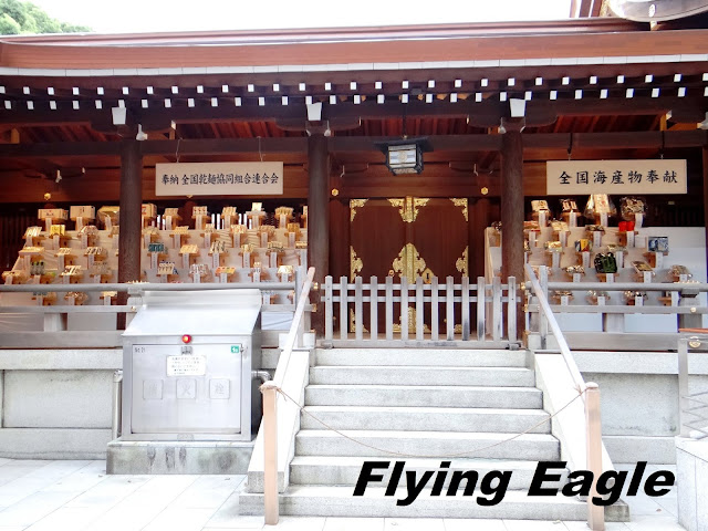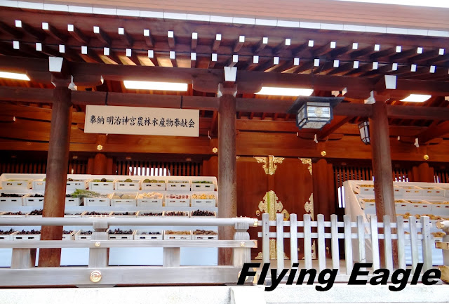 再往前就到了第三個鳥居,通常神社只有一個大鳥居,在這裡卻要穿過三個才能到達拜殿,可見其規模。拜殿前的廣場很大,果然符合皇室身分。殿前有兩棵樹種在一起,中間以繩子相繫。它們於神宫竣工那年栽種,被稱為夫婦楠,象徵明治和他的皇后,據說不少人來此祈求愛情順利、婚姻美滿。走了一圈,發現日本人供奉的物品真是什麼都有。有奉水的,數量之多連相機的角度都不夠寬。還有各行業供奉自己的產品,像是乾麵協會的乾麵,和農林業的蔬菜水果,另外還有海產,林林總總,應有盡有。