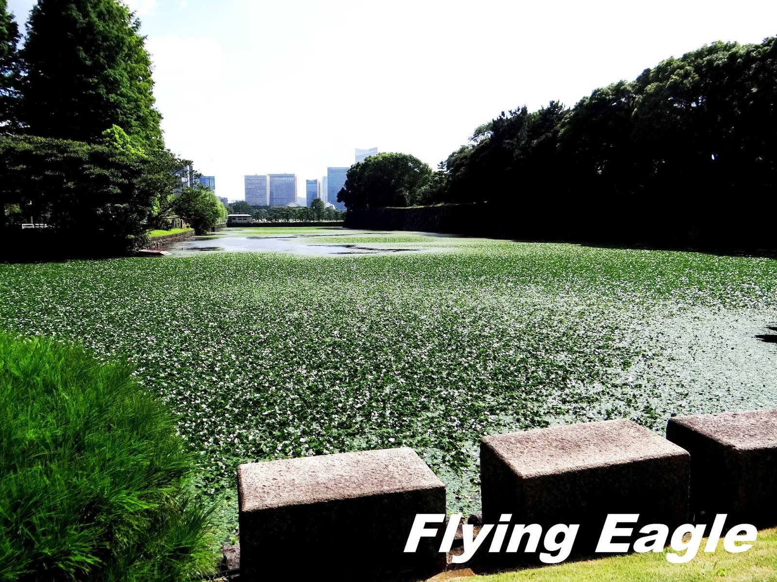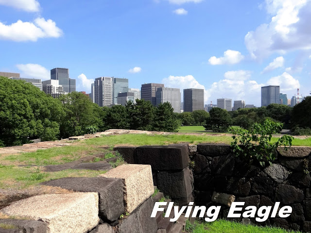 自明治維新遷都東京之後,皇居便成了日本天皇的居所。想要參觀皇居必須事先預約,否則就得現場排隊。皇居旁的皇居東御苑是原本的江戶城所在,德川幕府的歷代將軍及明治天皇都曾於此居住,如今整修成為皇室的花園。由於它既有歷史遺跡又不需預約,我們便捨棄皇居而取皇居東御苑。未進東御苑先看到寬廣的護城河,河面滿是綠色植物。我們從正門(大手門)進入,很快便到天守台。天守台原本樓高五層,曾是日本最高的建築,但它在17世紀中慘遭祝融,雄風不再。我們登上台頂,東京林立的高樓大廈彷彿近在咫尺。