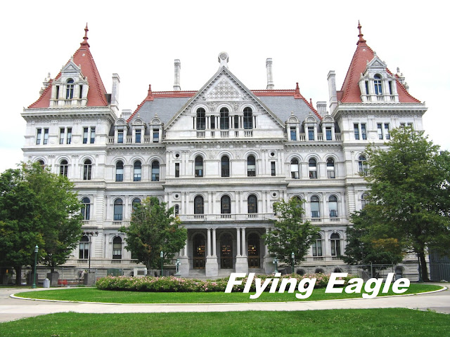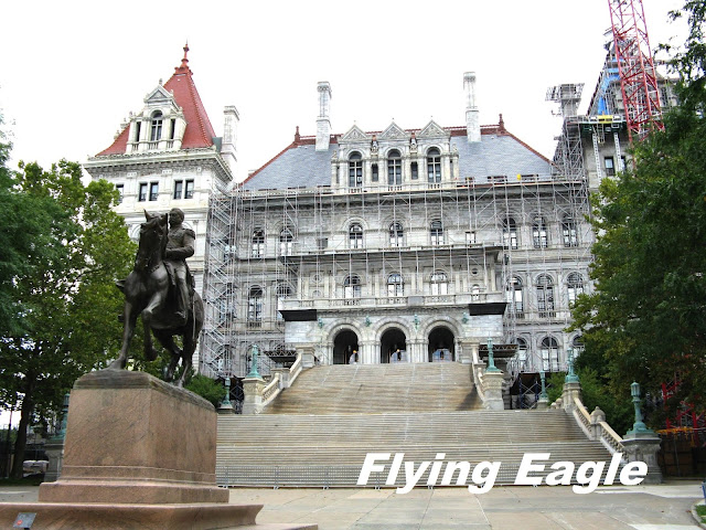 紐約州的首府是奧本尼市,它的人口有9萬餘人,除了是州府所在地,還有郡政府和市政府,所以可以想見當地居民有很多人是在政府單位上班。州府建築頗為氣派壯觀,像座宮殿或是藝術館。我們到訪時不巧正在維修,鋼架遮住了建築主體的一部分。建築主體前面有長長的階梯,主體兩翼有著紅色的屋頂。全美只有11座州府未採用國會山莊圓頂的設計,紐約州便是其中之一。州府建築正門立了Sheridan將軍的銅像,以紀念他在美國南北戰爭中的貢獻。繞一個圈來到州府的後門,氣派不遜於前門,而且沒有鋼架遮住,像富麗堂皇的大莊園主屋。後門這邊則有華盛頓的銅像,可惜沒把它一同攝入鏡頭。