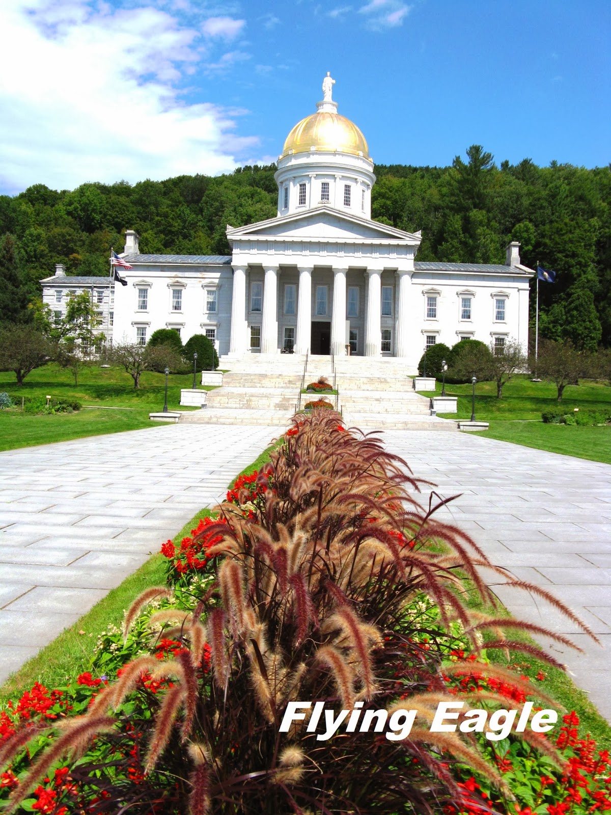 我們抵達蒙佩利爾後,從大老遠就看到州府金光閃閃的屋頂。州府座落在一個叢林茂密的小山丘之前,州府建築的前面有著佔地頗大的廣場,氣派一點都不亞於大州的州府廣場。廣場上花木扶疏,色彩繽紛。這是該州第3個州府建築,它保留上一個州府的一部分並加以擴充,據說原設計是以雅典神廟為基礎,這種仿希臘神廟的建築風格在19世紀上半,在歐洲和美國都頗為風行。州府外觀看來很像華府的國會山莊,有著多數州府都有的圓頂設計,只不過這裡的圓頂金碧輝煌,十分耀眼。金色圓頂的頂端立有一尊雕像,是希臘羅馬神話中掌管農業的羅馬女神。佛爾蒙特的州府建築,被著名的建築師們譽為美國最為優雅的州府之一。