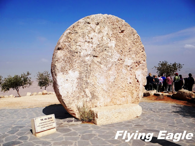 一上尼波山便有幾塊大石頭引人注意。首先是入口處巨大的愛之書(Book of Love)雕塑,書側用拉丁文寫著以弗所書4:6「一神,就是眾人的父,超乎眾人之上」;書的前面則刻有摩西和其他聖經人物的臉孔。同樣位在入口附近的是摩西紀念碑(Memorial of Moses),上面寫著尼波山是基督教的聖地。第三塊是圓形的大石,是拜占庭時期修道院的門。這種滾動的石門,我們前兩次聖地之旅在花園塜時也見過。從山上遠望,死海和約但河谷盡入眼簾。據說天氣晴朗時,還可看到耶路撒冷的橄欖山。