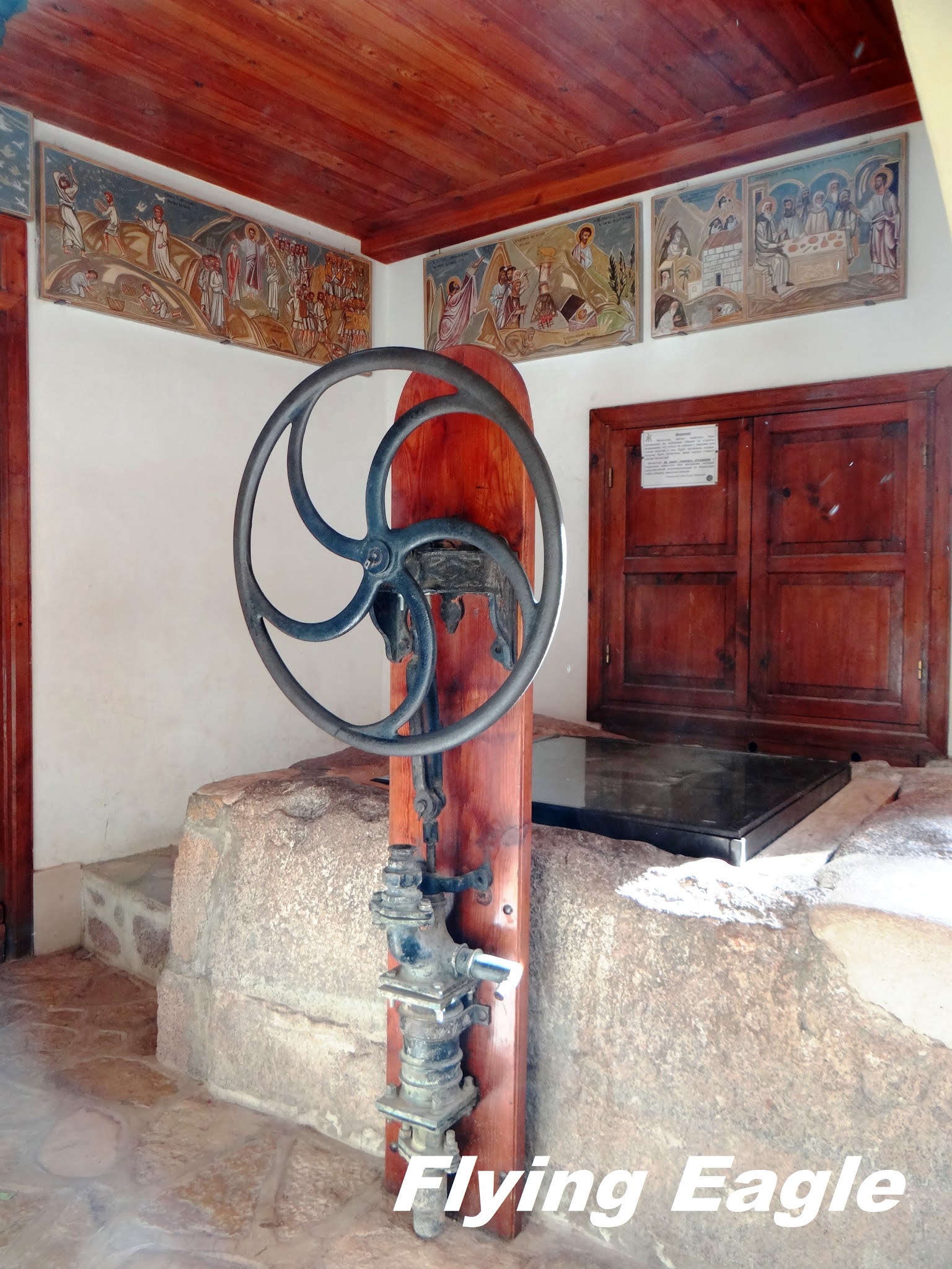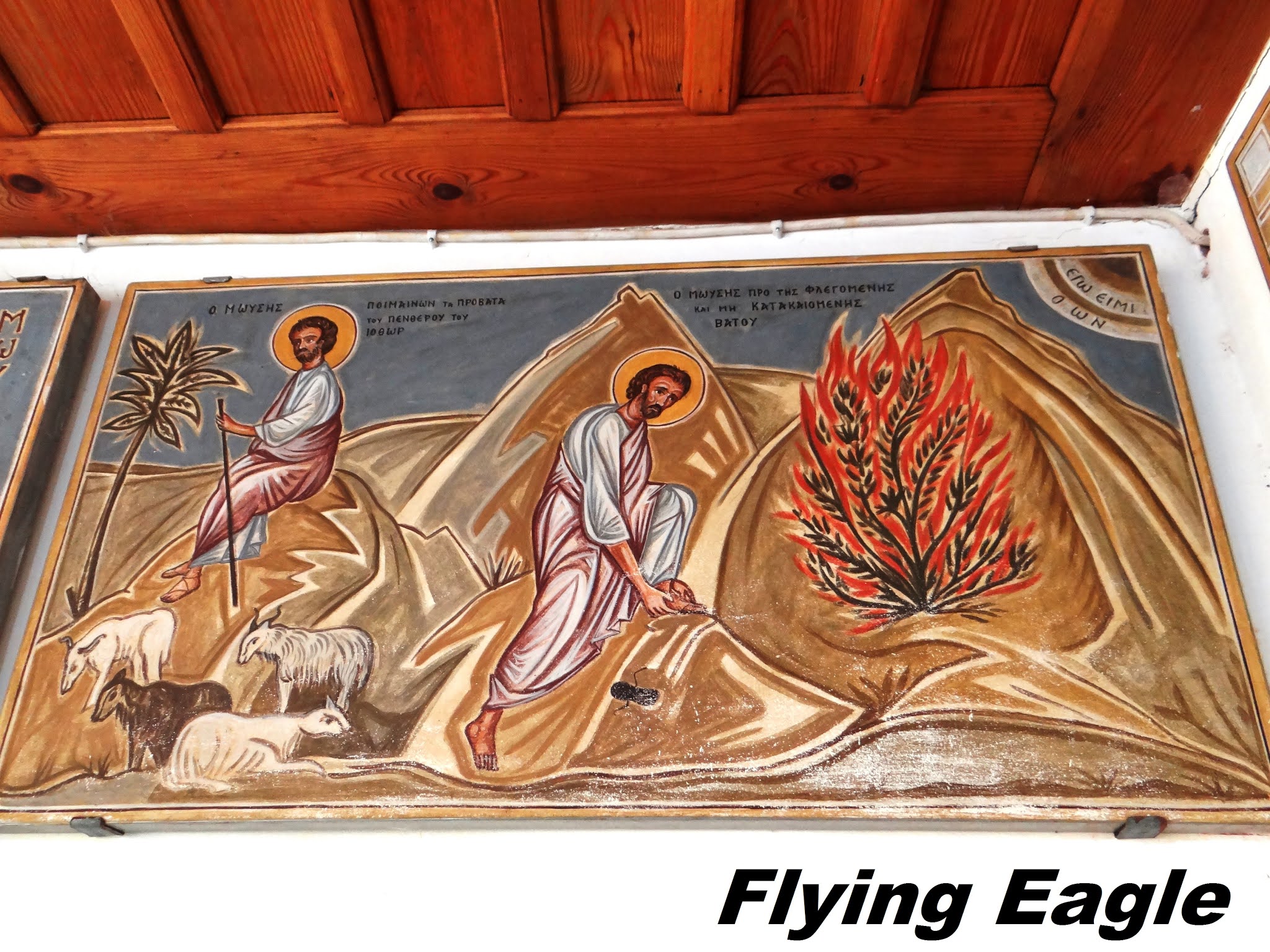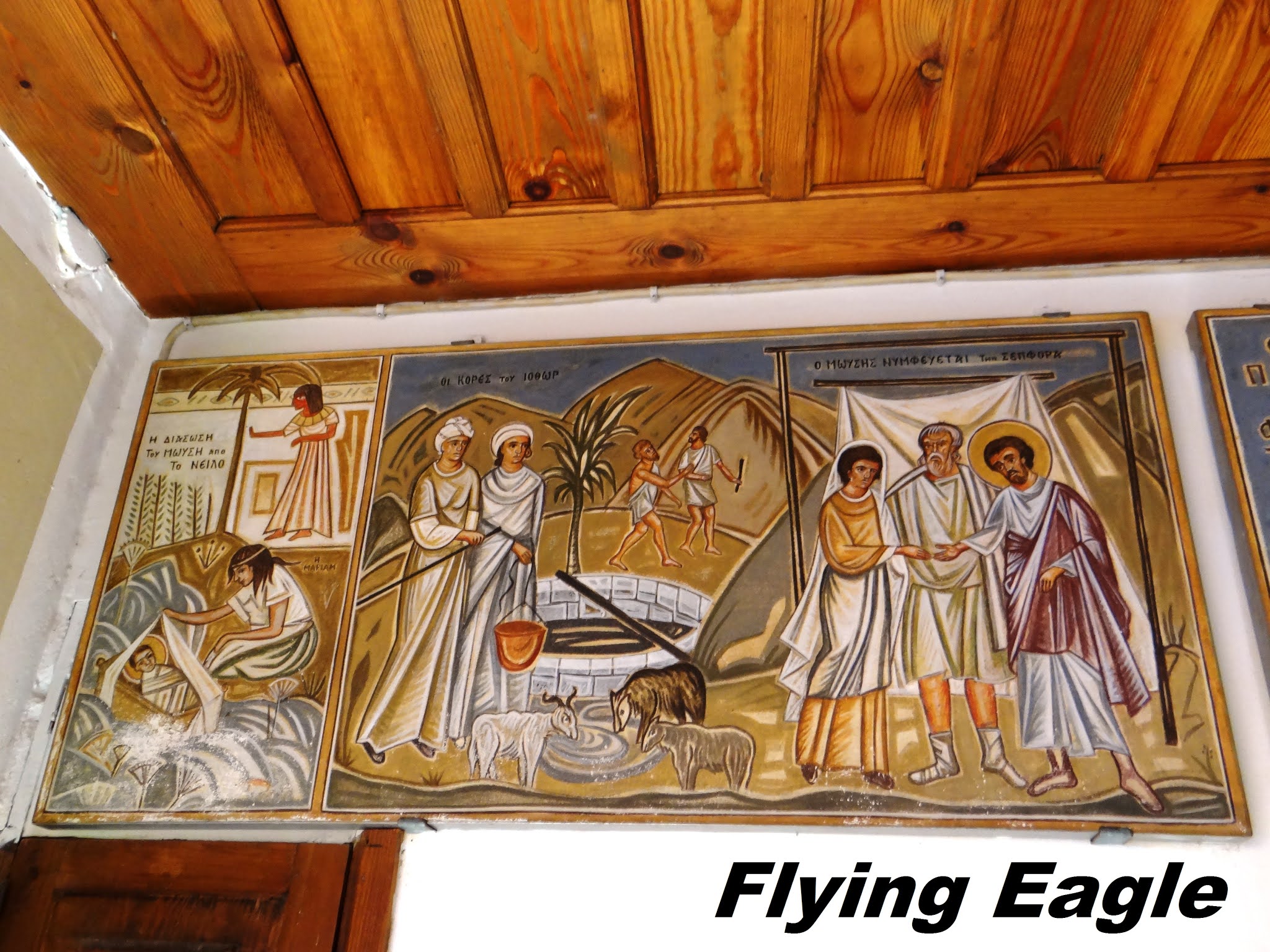 進得院內,牆上高掛的畫作均有聖經典故,其中兩幅和這裡的景點相應。其一描繪的是摩西井,米甸祭司的七個女兒到井邊打水給羊群喝,遭人驅趕。摩西英雄救美,米甸祭司便把女兒西坡拉嫁給了他(出埃及記2:16-21)。另一幅畫的是耶和華的使者從荊棘裡火焰中向摩西顯現,荊棘被火燒著,卻沒有燒毀。耶和華神並吩咐摩西,帶領以色列人出埃及(出埃及記3:1-10)。一些考古學家相信,摩西井和荊棘叢都位於修道院內,難怪當年修道院選址於此。現場還有塊大石頭,導遊說上面的荊棘變成了化石,細看果然植物的葉子十分清晰。
