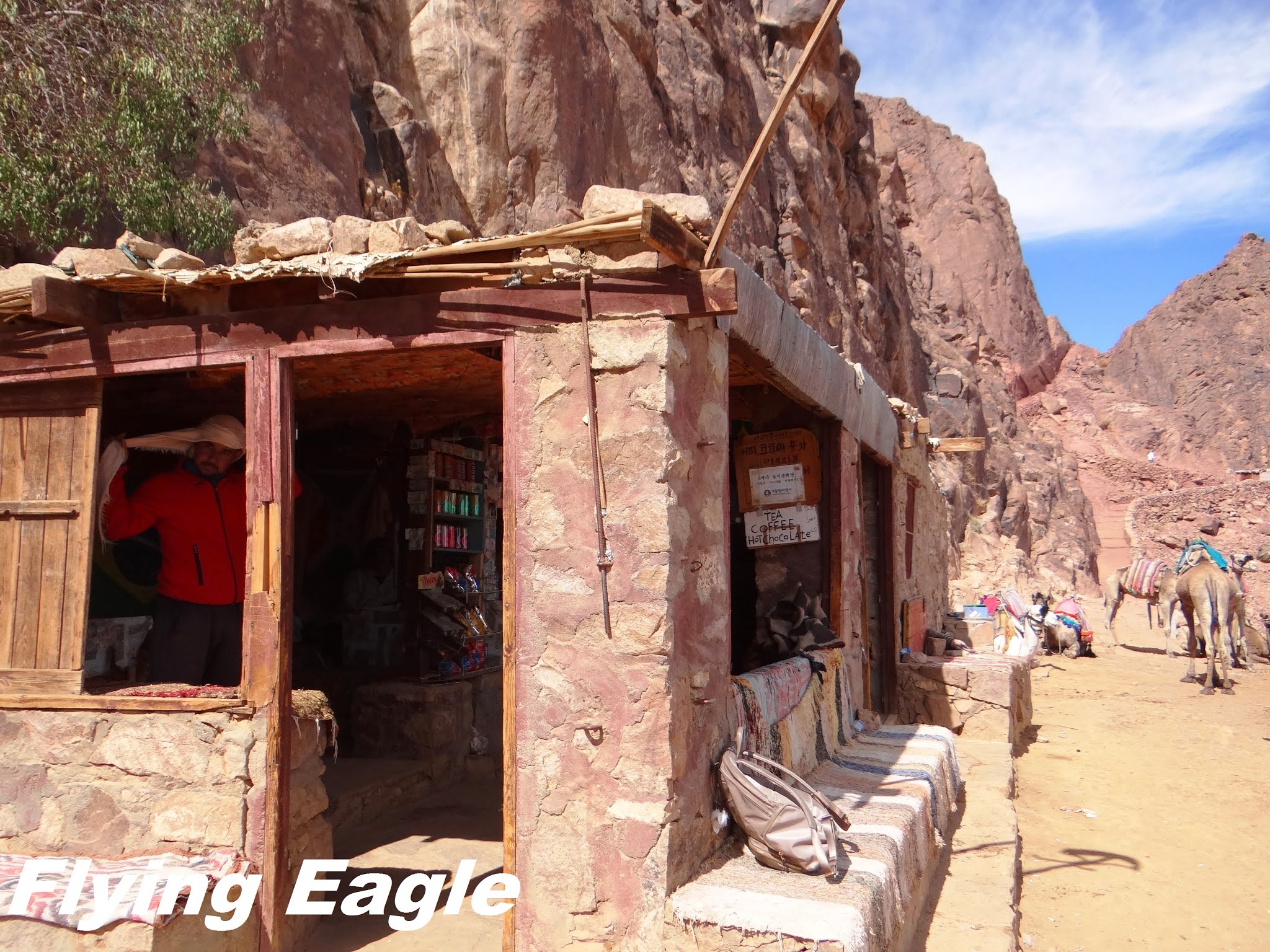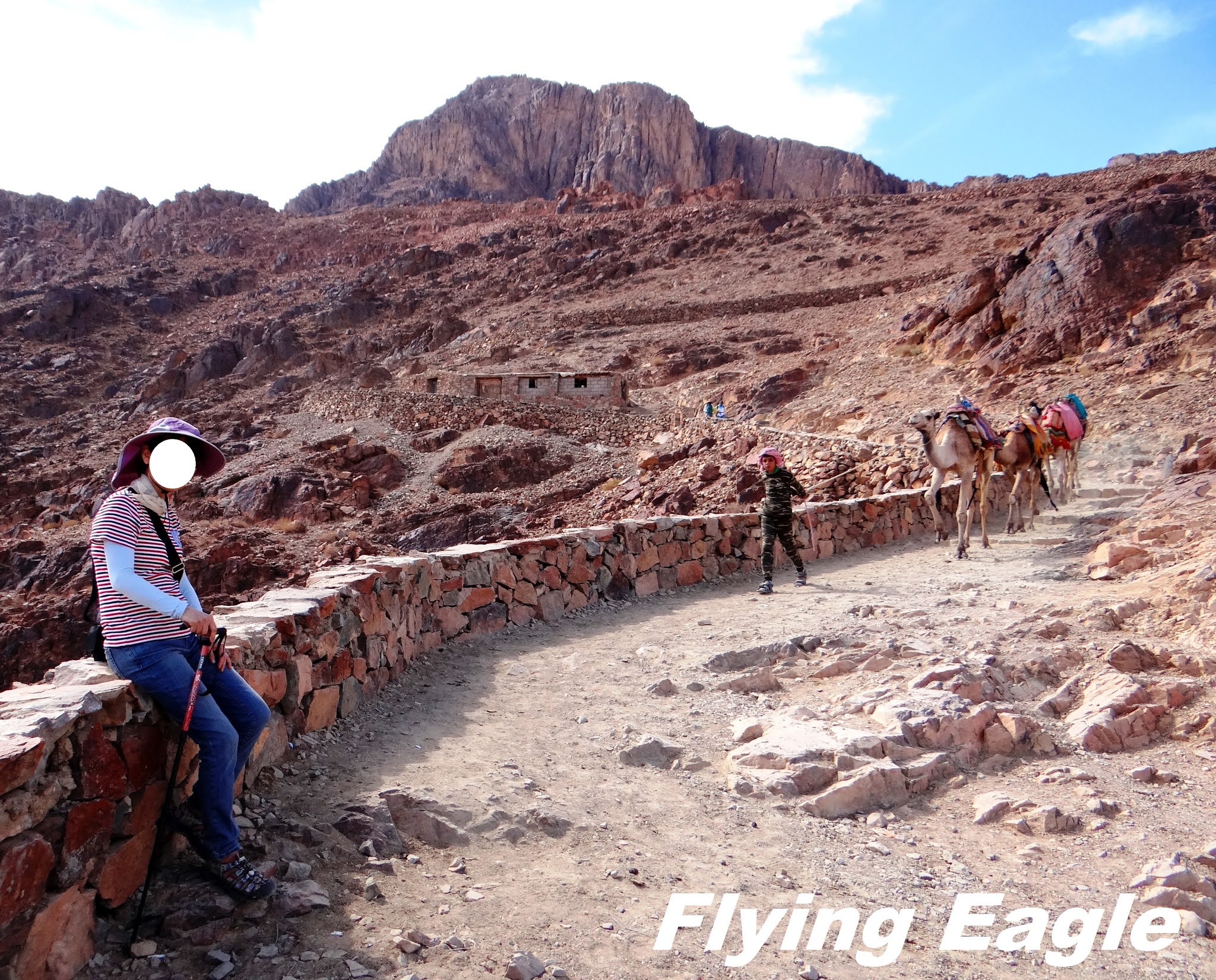 總算來到山頂小店,也就是我們的終點。再往上走750個階梯,便是西乃之巔,該處有座東正教的教堂。騎駱駝騎了一個多小時,大家都腰酸背痛,很開心可以下來歇息,也把握機會和自己的座騎合影。此時一位男團友在商店門口摔了一跤,扭傷了腳。很快又有年輕的女團友突然暈厥,大伙兒手忙腳亂讓她躺平。幾分鐘後,一位東南亞的女遊客也在門口摔跤,手掌擦破流血,可見上山讓大家都筋疲力盡。