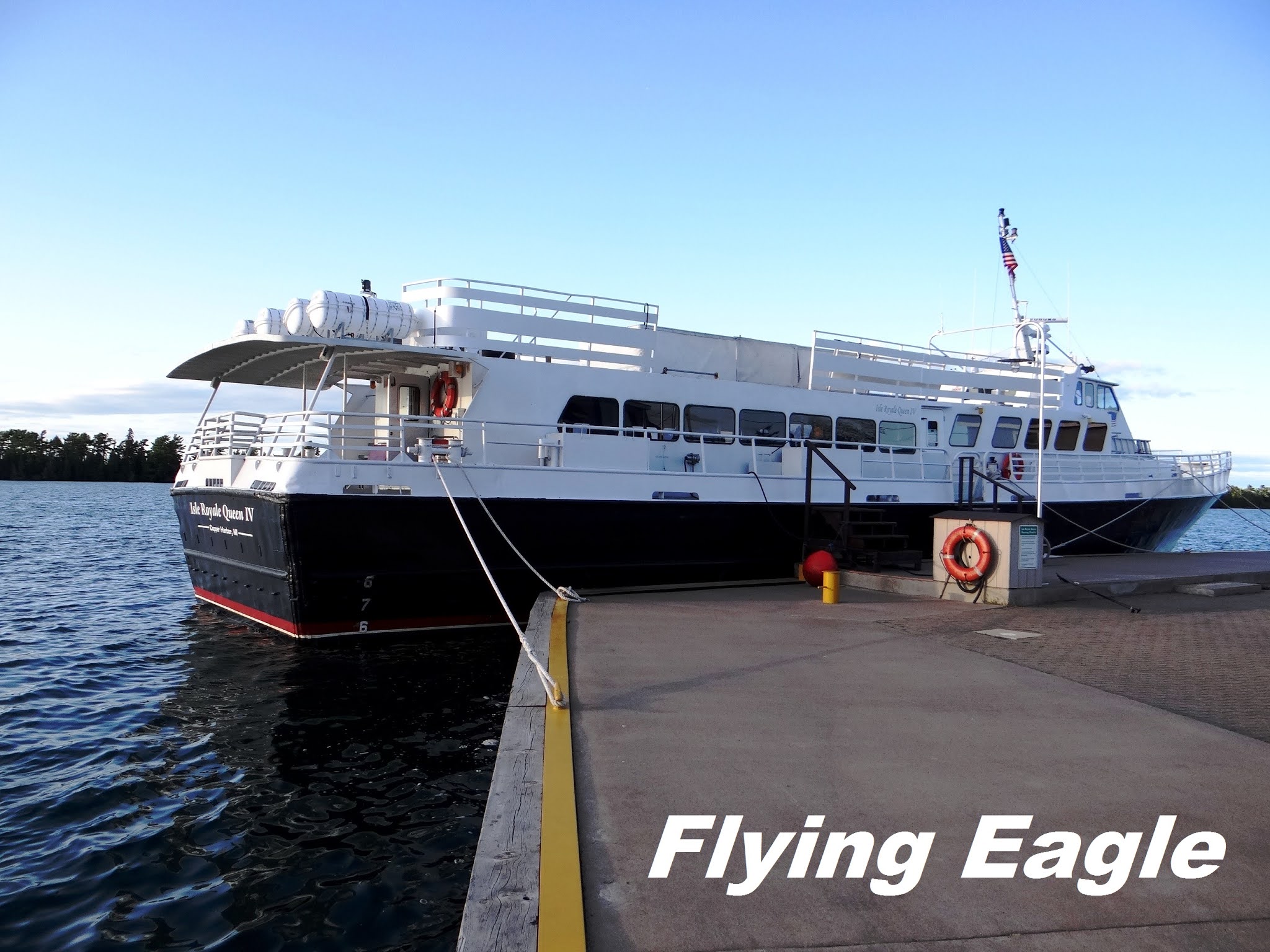 皇家島國家公園的港口除了前一篇寫的溫迪哥(Windigo),還有位在東北方的岩港(Rock Harbor)。我們從密西根州的銅港(Copper Harbor)搭乘皇家島皇后四號(Isle Royale Queen IV)前往,航程約3.5小時,來回票價每人136美金。清晨,我們在碼頭準備登船,看到三隻水鴨徜徉湖上,牠們排成一列,就像排隊的旅客一樣。