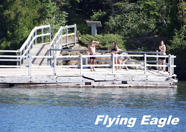 到了離島的時間,皇家島皇后四號的乘客依依不捨地登船,逗留島上3個小時實在太短啦!回程多半的人都呼呼大睡,和去程的光景大不相同。我們在睡睡醒醒間,也瀏覽了周遭景物。蘇必略湖的船隻極少,最後總算看到一艘貨輪,上面有著雙塔,禁不住想起著名的倫敦塔橋。皇后四號回到銅港時,湖畔餐廳的員工居然跳起康康舞歡迎我們,實在是別出心裁的招徠手法。