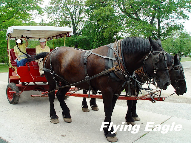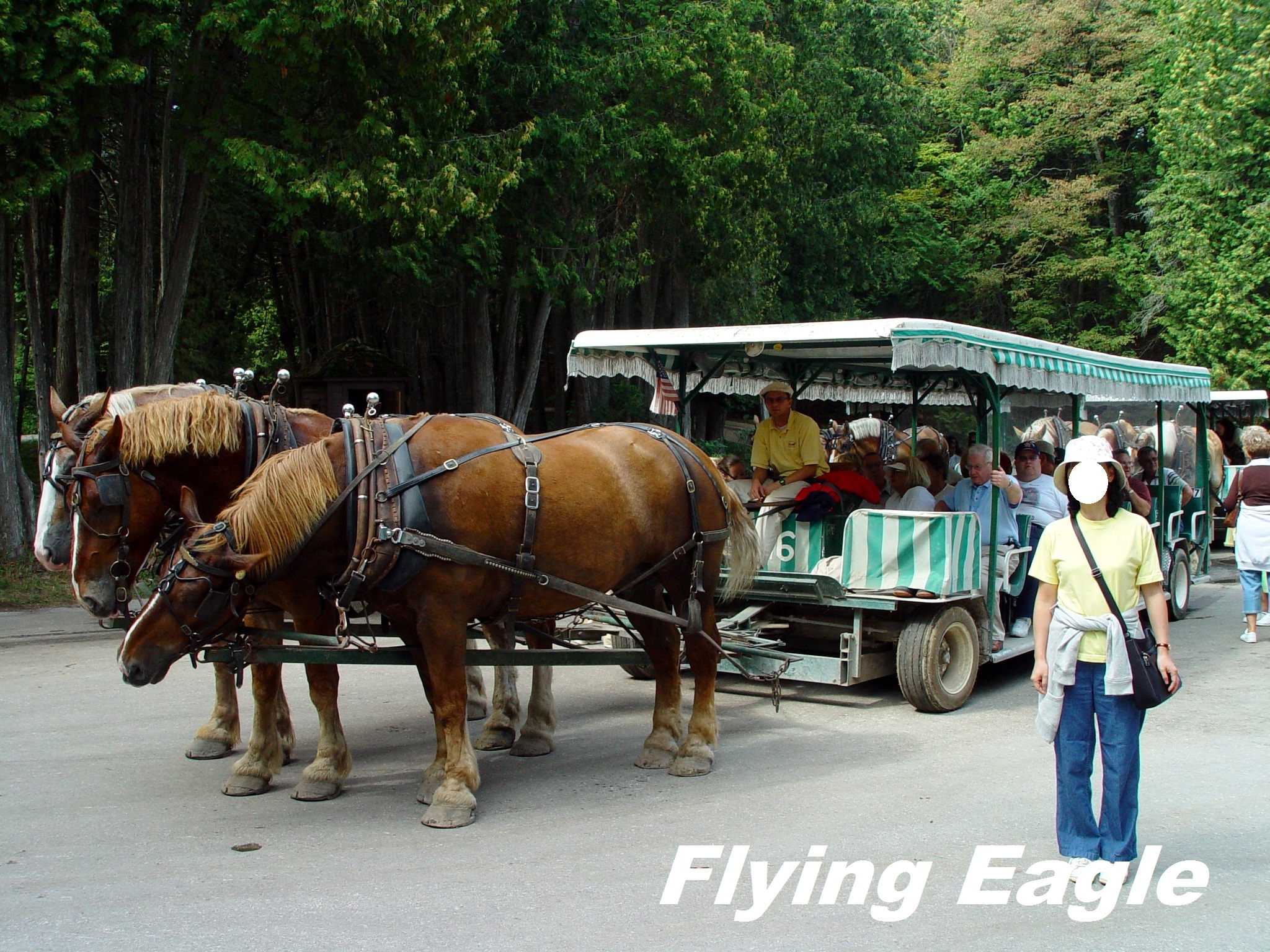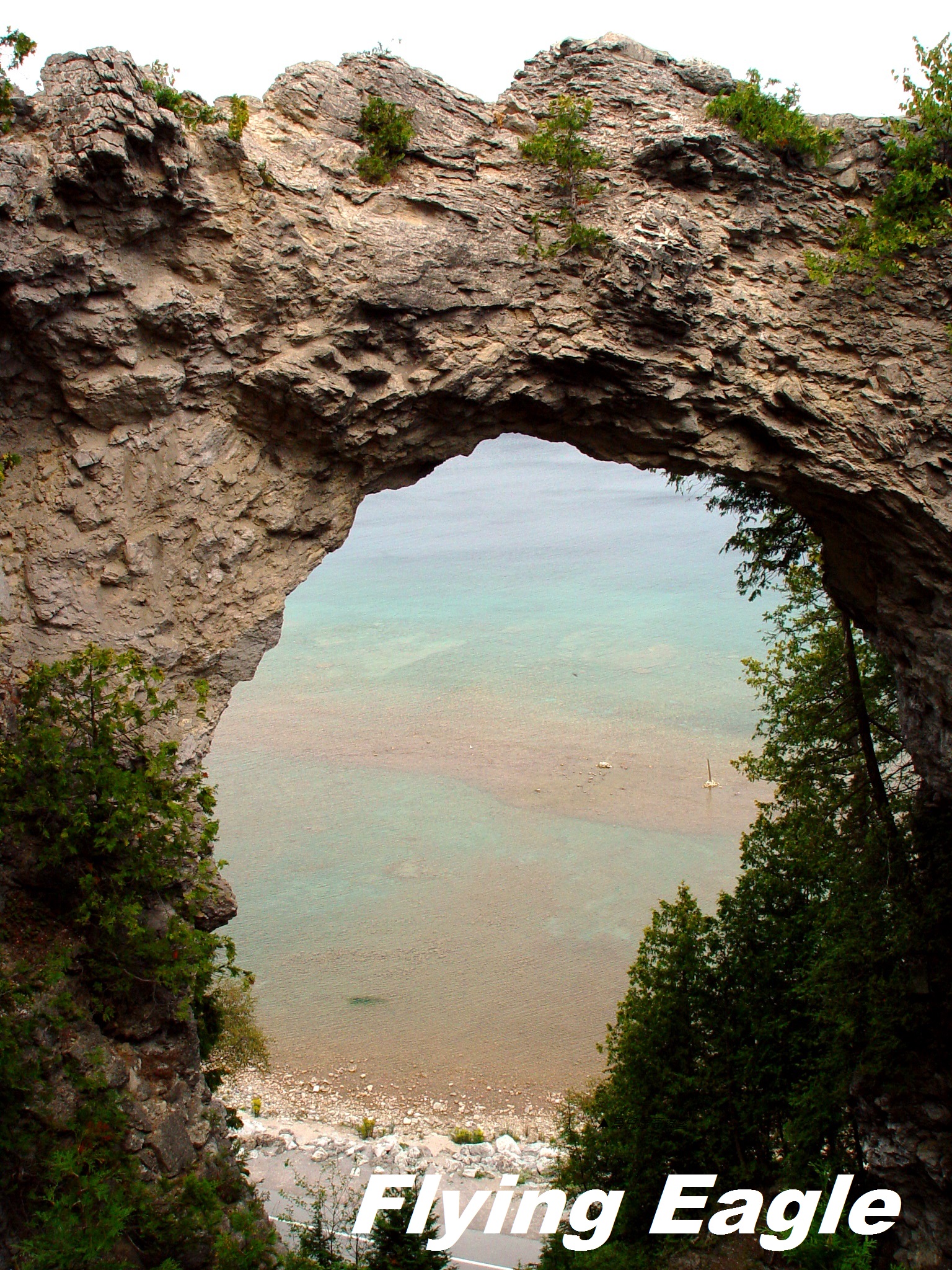 我們搭乘觀光馬車走訪島上著名景點,包括蝴蝶溫室(Butterfly Conservatory)、拱門岩(Arch Rock)、麥基諾碉堡和格蘭飯店。拱門岩是天然的石灰岩,高146呎(45公尺) 、寬逾50呎(約15.2公尺)。美國原住民見其聳立在休倫湖邊,認為它有神聖的力量,也衍生出不少傳說。