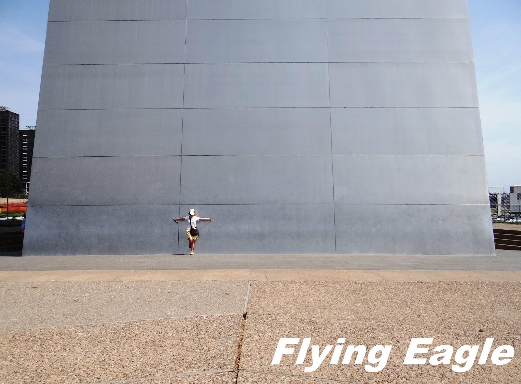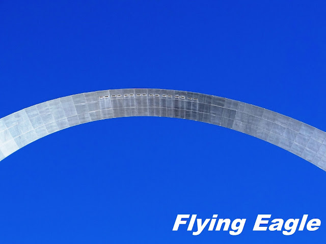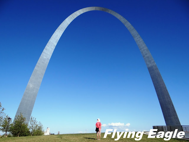 之後我們轉到市區的伊茲橋(Eads Bridge)上欣賞拱門,從全新的角度觀看拱門之後,突然有種「橫看成嶺側成峰,遠近高低各不同」的感受。最後我們回到拱門下,此時天氣晴朗,藍天白雲綠樹襯托著拱門,構成美麗的畫面。好不容易等到人潮散去,趕緊抓住這一剎那和拱門獨照,多麼珍貴的擁有!抬頭仰望,拱門頂端觀景台的窗戶清晰可見,也許此刻正有人在和我對望呢!