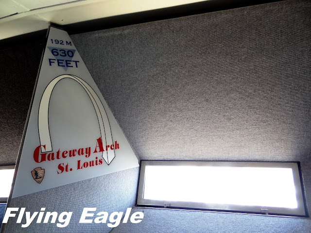 拱門內原來還別有玄機。它的兩條大長腿裡裝有電車,只需四分鐘便可以運送遊客到頂端的觀景台。狹長的觀景台可容納160人,兩邊設有窗戶。除了可觀看聖路易的市景,相鄰的伊利諾州也映入眼簾。由高空俯瞰,綠色屋頂、格局工整的舊法院,以及聖路易紅雀棒球隊(St. Louis Cardinals)的布希體育場(Busch Stadium)都十分顯眼。混濁的密西西比河同樣讓人印象深刻,河對岸的噴泉(Gateway Geyser)乃人造噴泉,是1995年才增設的。在無風的時候,水柱可以噴發至和拱門一樣的高度,兩者隔著河水相互呼應。