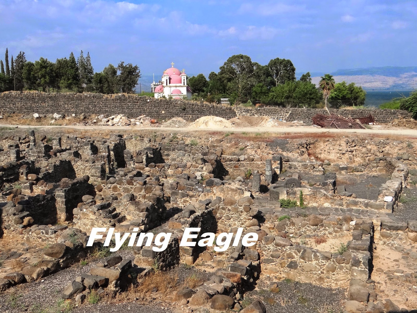 迦百農還有一些拜占庭時期村落的遺跡,我們遠遠望見一座美麗的粉紅色教堂,讓人驚豔,畢竟教堂通常都是莊嚴肅穆的風格,很少見漆成這種輕鬆浪漫的顏色。這教堂叫做十二使徒教堂(The Church of the Twelve Apostles),是為記念主耶穌在迦百農一帶設立使徒而建造的希臘正教教堂。離開迦百農前,我們還見到有尊彼得的銅像,他左手拿著權杖,右手拿著天國的鑰匙,腳邊還有條魚。雕像底座寫著主耶穌在馬太福音16:18對彼得說的話:「你是彼得,我要把我的教會建造在這磐石之上。」這是何等重大的託付!而彼得的確也不負所託,終其一生盡心服事神。