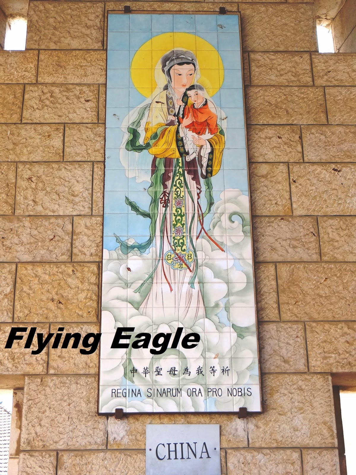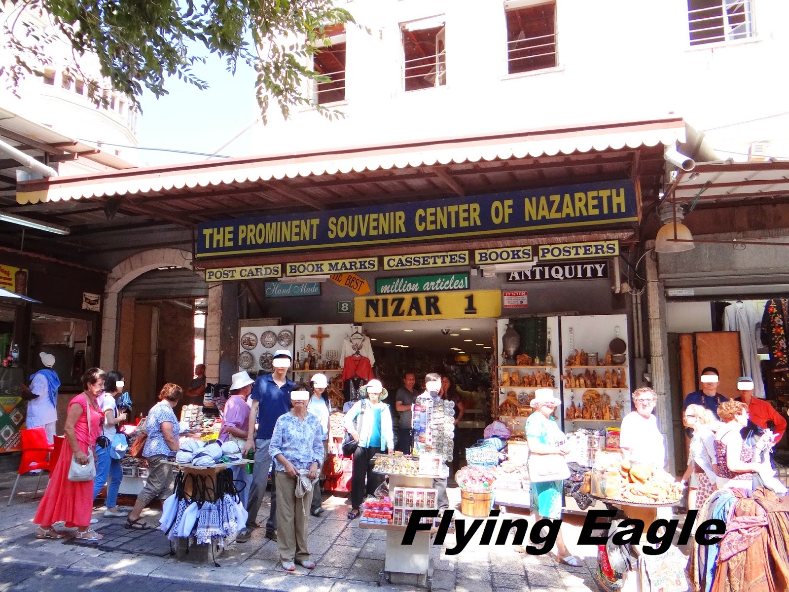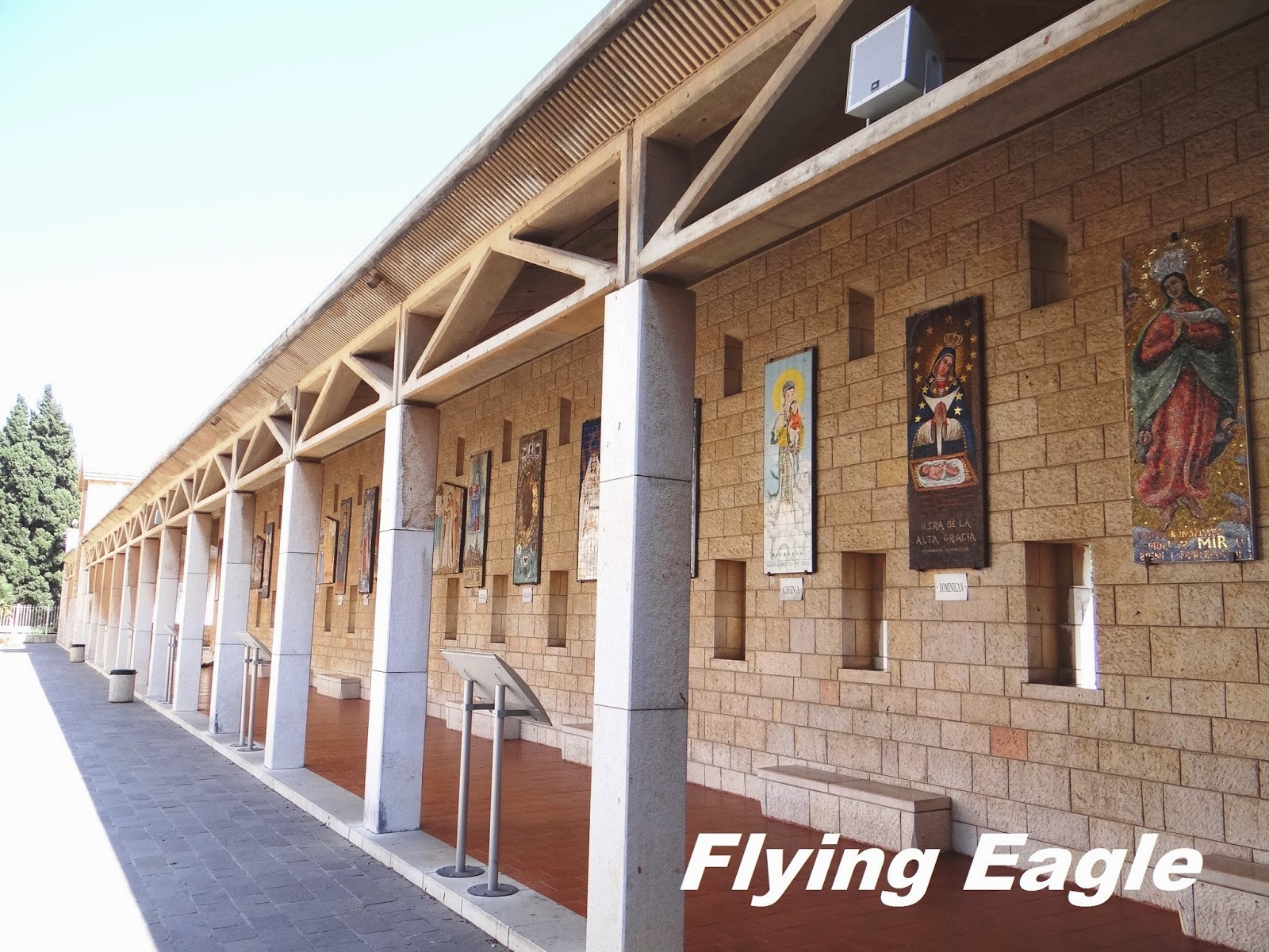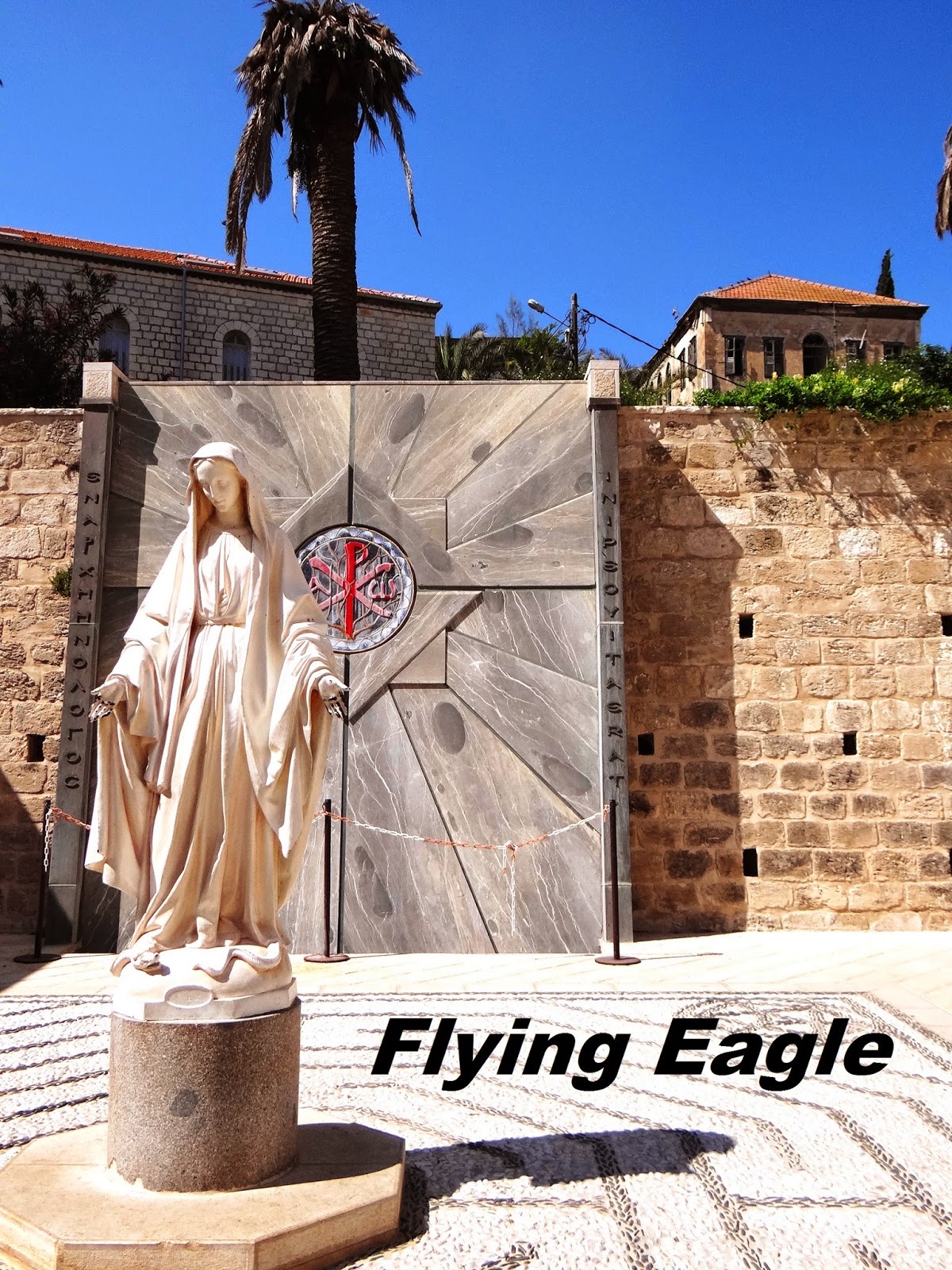 參觀完教堂內部後,我們再回到中庭,看到側門旁邊立著一尊人形大小的馬利亞雕像。雕像後面有個英文P和X交疊的符號,其實是希臘文,這是Chi-Rho symbol,它象徵著主在十架上受死,也表明祂是基督。因為天氣酷熱,我們離開教堂後就到當地的小店享受道地的清涼飲料,拿撒勒街頭頗為熱鬧,已非主耶穌時代外藉藉無名的小城鎮。