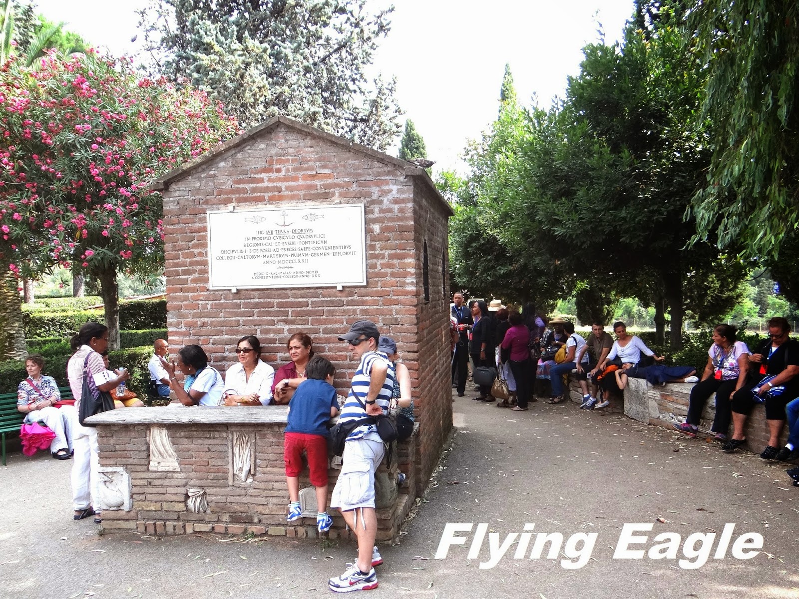 地下墓穴由羅馬教廷管理,管理處安排一位來自香港的鍾桂生神父為我們講解。也許鍾神父居住在義大利久了,很少碰見華人,看到我們很是興奮。他雖年邁,但熱情活力十足,是位很可愛的老人家。這時晴朗的天氣說變就變,突然下起大雨來,弄得沒帶傘的團友狼狽不堪。好不容易大家都躲在遮雨棚下了,竟然下起冰雹了!冰雹此起彼落地打在棚底和地上,造成噼哩啪啦的巨響。夏天下冰雹,對許多團友都是個頗新奇的經歷。