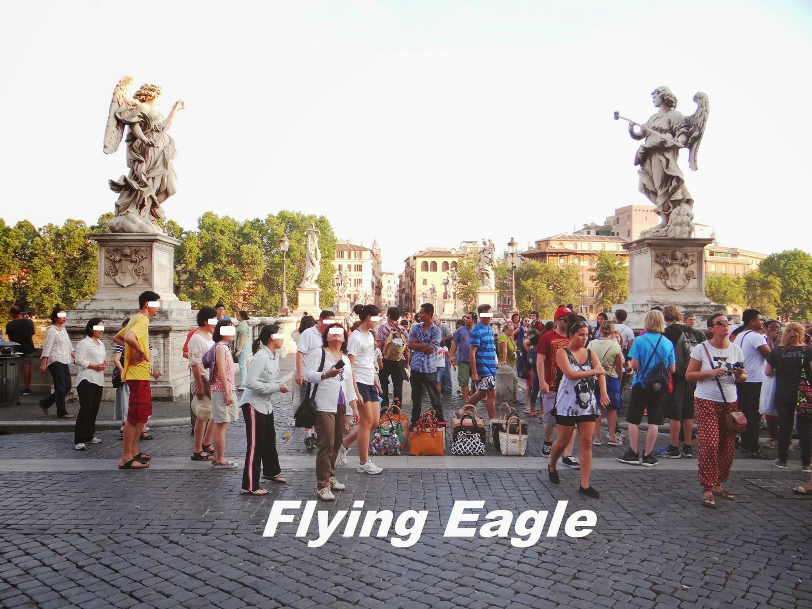 ▲聖天使橋的一端有攤販在賣假名牌包。