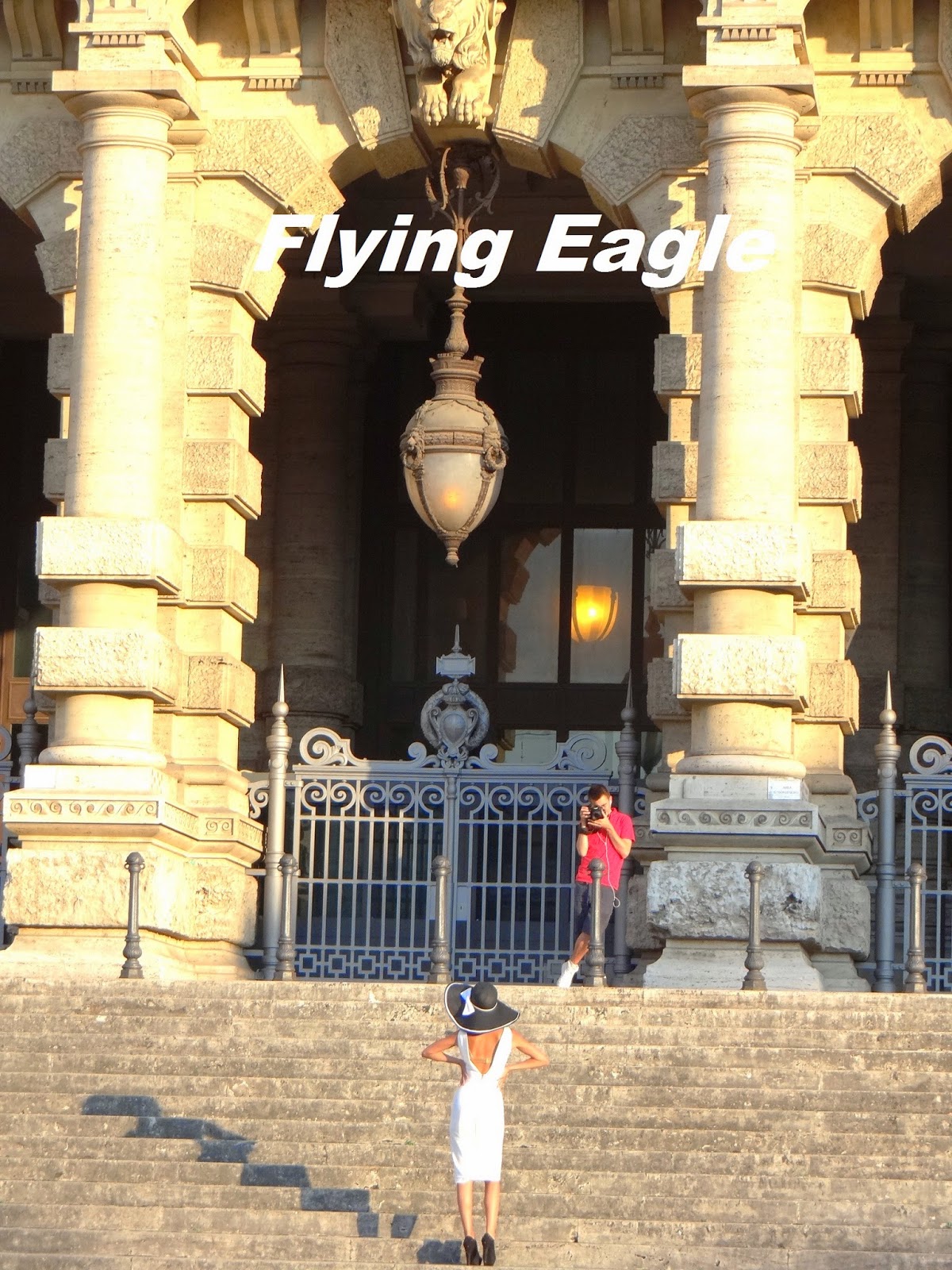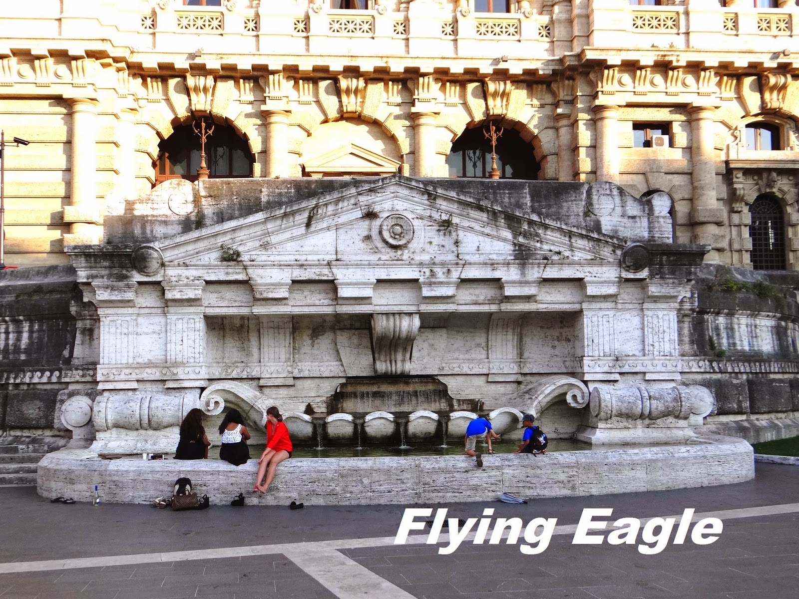 司法宮裡面有義大利的最高法院和司法公共圖書館,門前的廣場(Piazza Cavour)有尊銅像,他是Cavour伯爵,在義大利統一運動中居功厥偉。看到他的雕像面對司法宮總覺哪裡不對勁,後來才發現,一般建築之前的銅像都是背對建築,面向大馬路,Cavour伯爵卻是面對建築。司法宮前有個噴水池,這好像是羅馬重要建築必有的設備。一位攝影師和打扮時尚的模特兒正在這裡拍照,被我們捕捉到畫面,有點像「螳螂捕蟬,黃雀在後」。