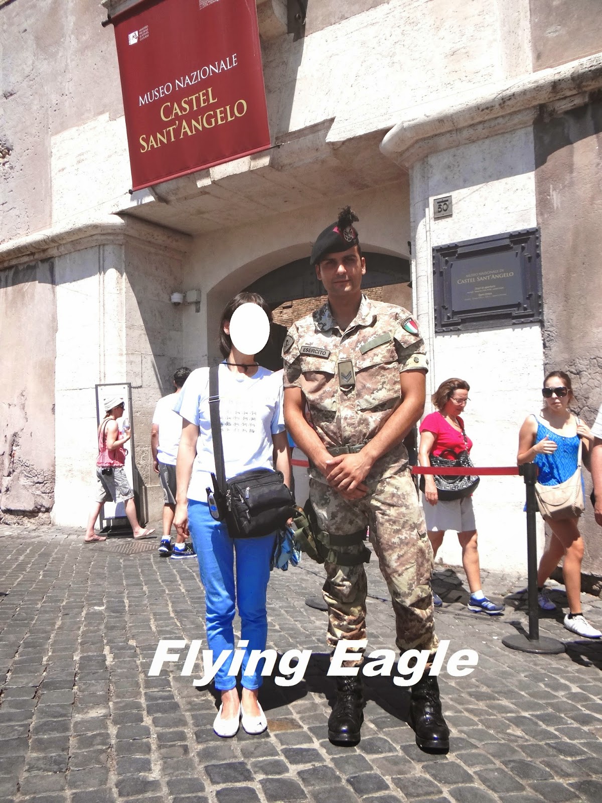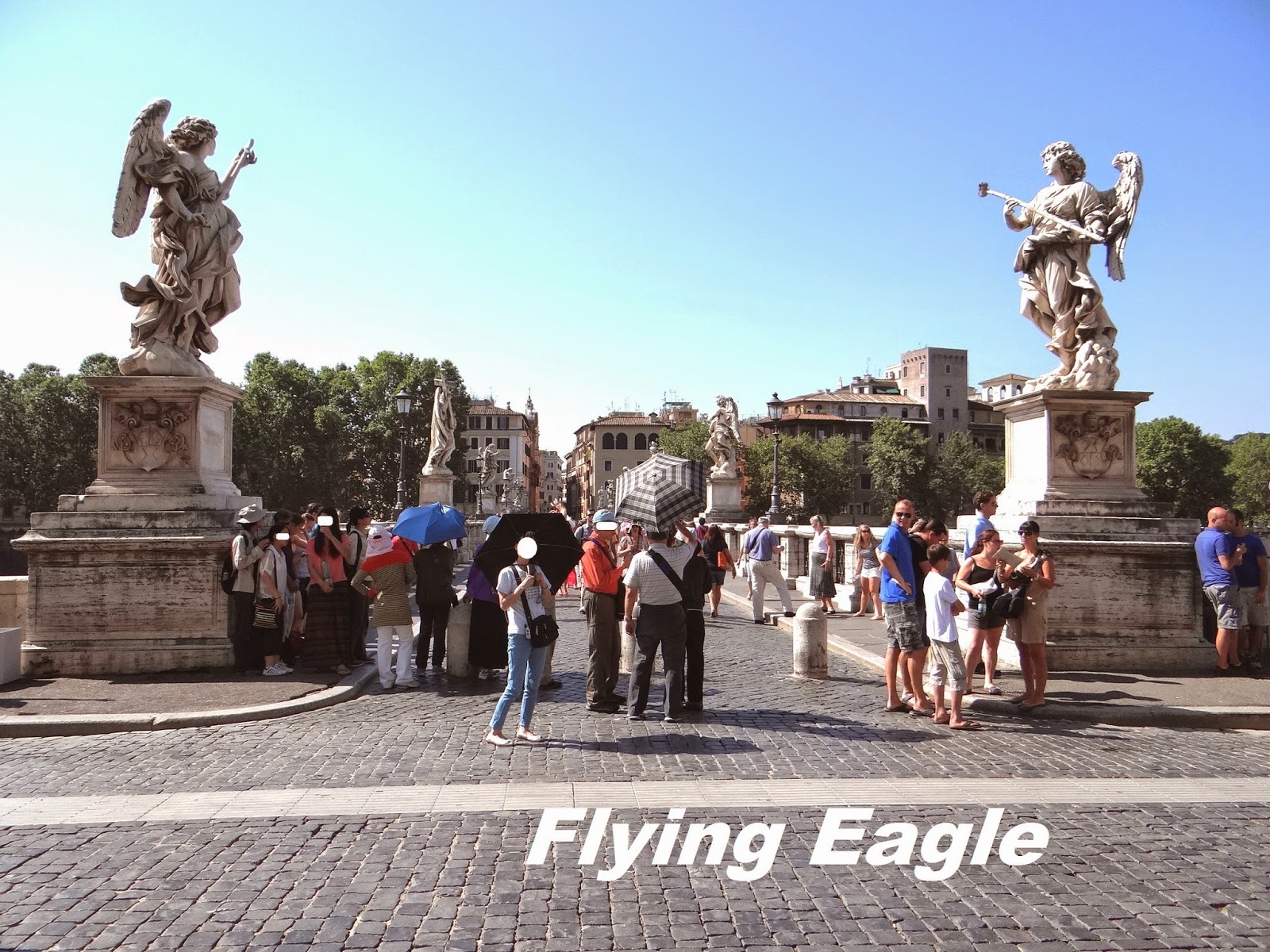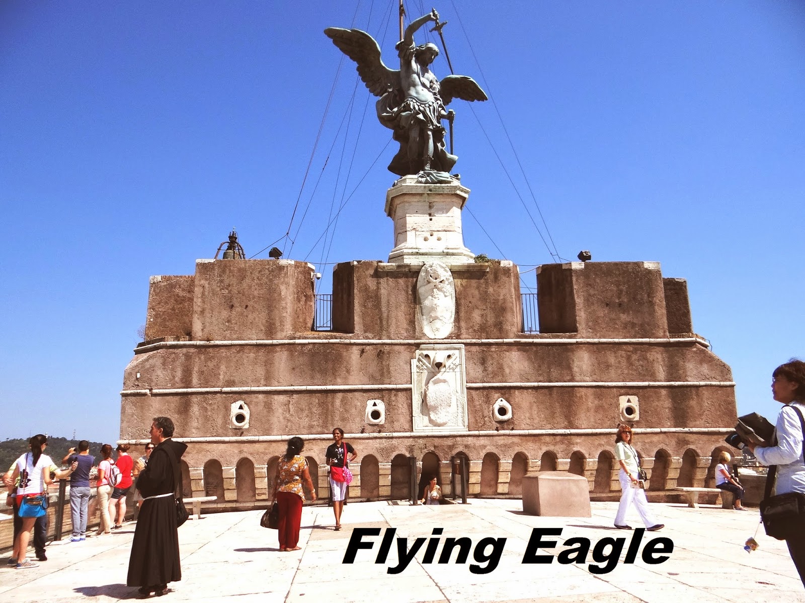聖天使堡原是哈德良在公元2世紀為自己和家族所興建的陵墓,所以原名哈德良陵墓。在6世紀時,黑死病肆虐羅馬,據說教宗貴格利一世在哈德良陵墓見到了收刀入鞘的天使長米迦勒,意即病源已被斬除,自此這地方便被稱為聖天使堡。後來聖天使堡曾被用作城堡和軍事要塞,現今則是座博物館。聖天使堡距離梵蒂岡很近,堡的最頂端有米迦勒收刀入鞘的雕像。我們進堡時看到一位街頭藝人用黑衣黑帽把自己包起來,戴著白手套,還拿著一根紅色的三角叉。也許他想表達天使和魔鬼的衝突與矛盾,才來聖天使堡作此鬼魅打扮吧!