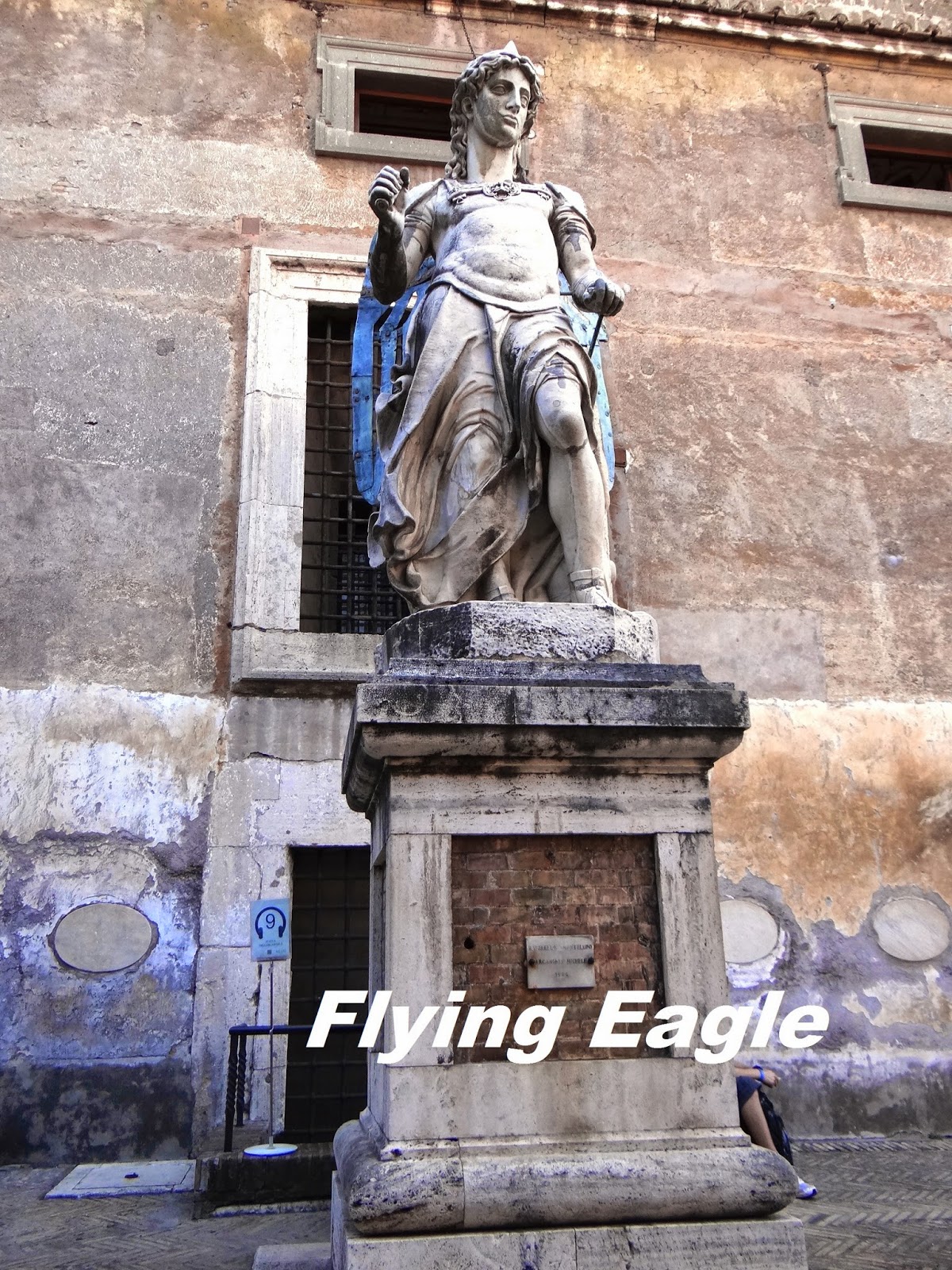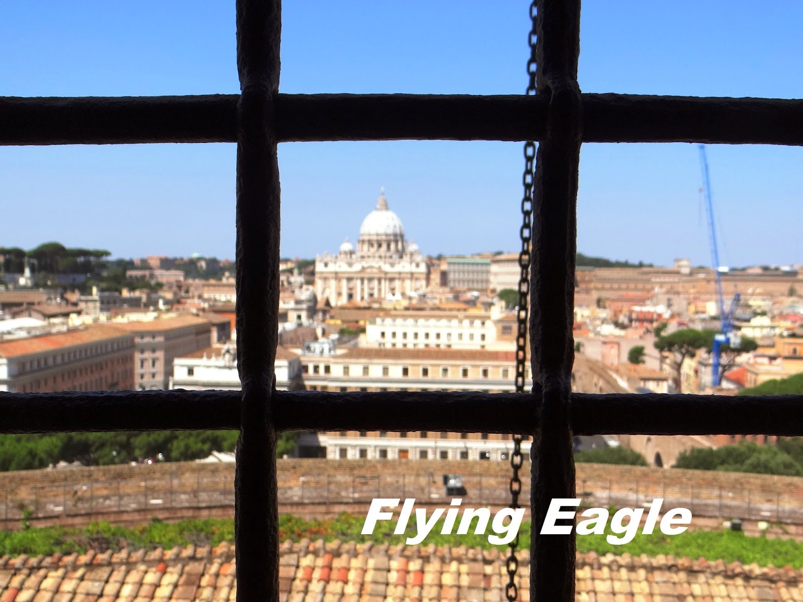 聖天使堡和聖彼得大教堂距離很近,所以從不同的高度和角度,都可望見不同風貌的聖彼得大教堂。我們走到聖天使堡中庭,見到一尊天使長米迦勒的大理石雕像,這本來是放置在堡的頂端,不過後來被一尊更大的米迦勒銅像取代,後者還有著收刀入鞘的動作,也許更切合聖天使堡的典故。