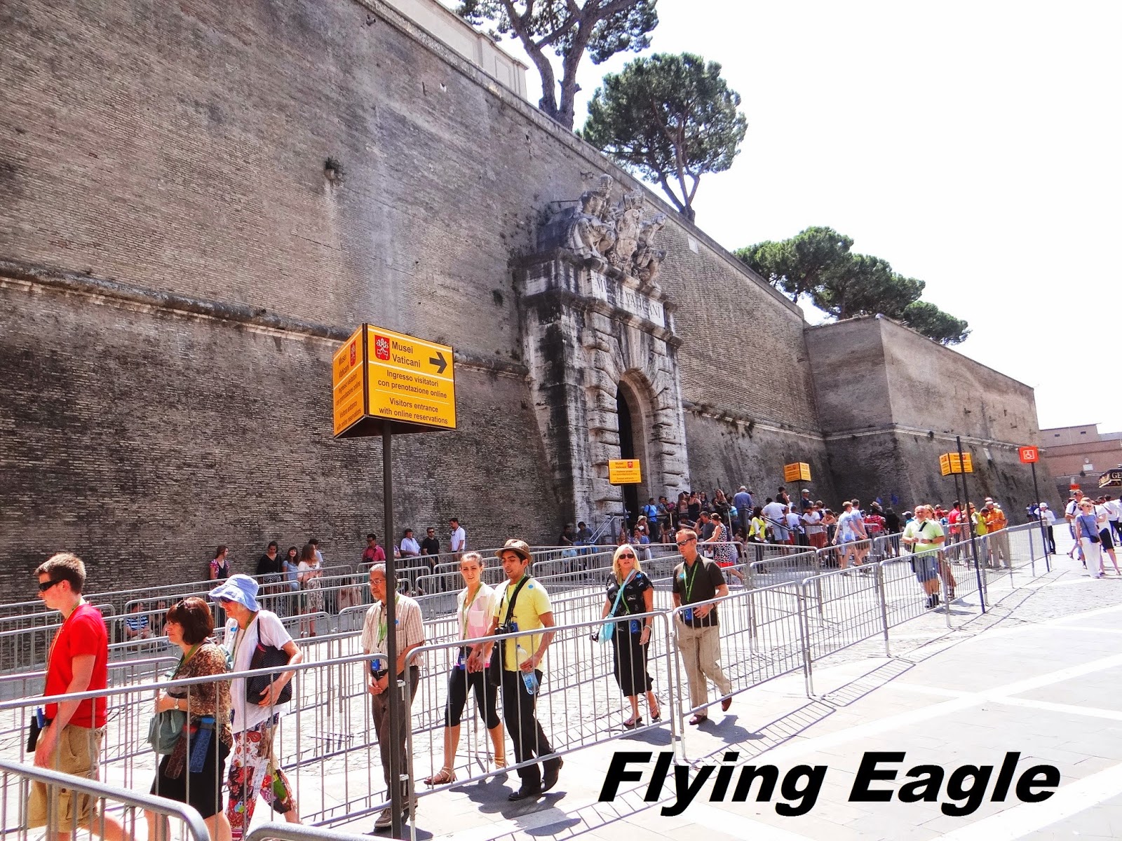 自從知道某些世界名畫被收藏在梵蒂岡的西斯汀教堂,對這個教堂便心生嚮往,這一天總算來到啦,我們接著就是要去梵蒂岡教廷!我們從梵蒂岡的外牆便開始排隊,很慶幸這一天的遊客不多,毋需久候。梵蒂岡位於義大利羅馬市,是非常罕見的國中國。它是世上土地最小、人口最少的主權國家,人口僅有800多而已,但是因為它是天主教的信仰中心,在全球具有舉足輕重的影響力。