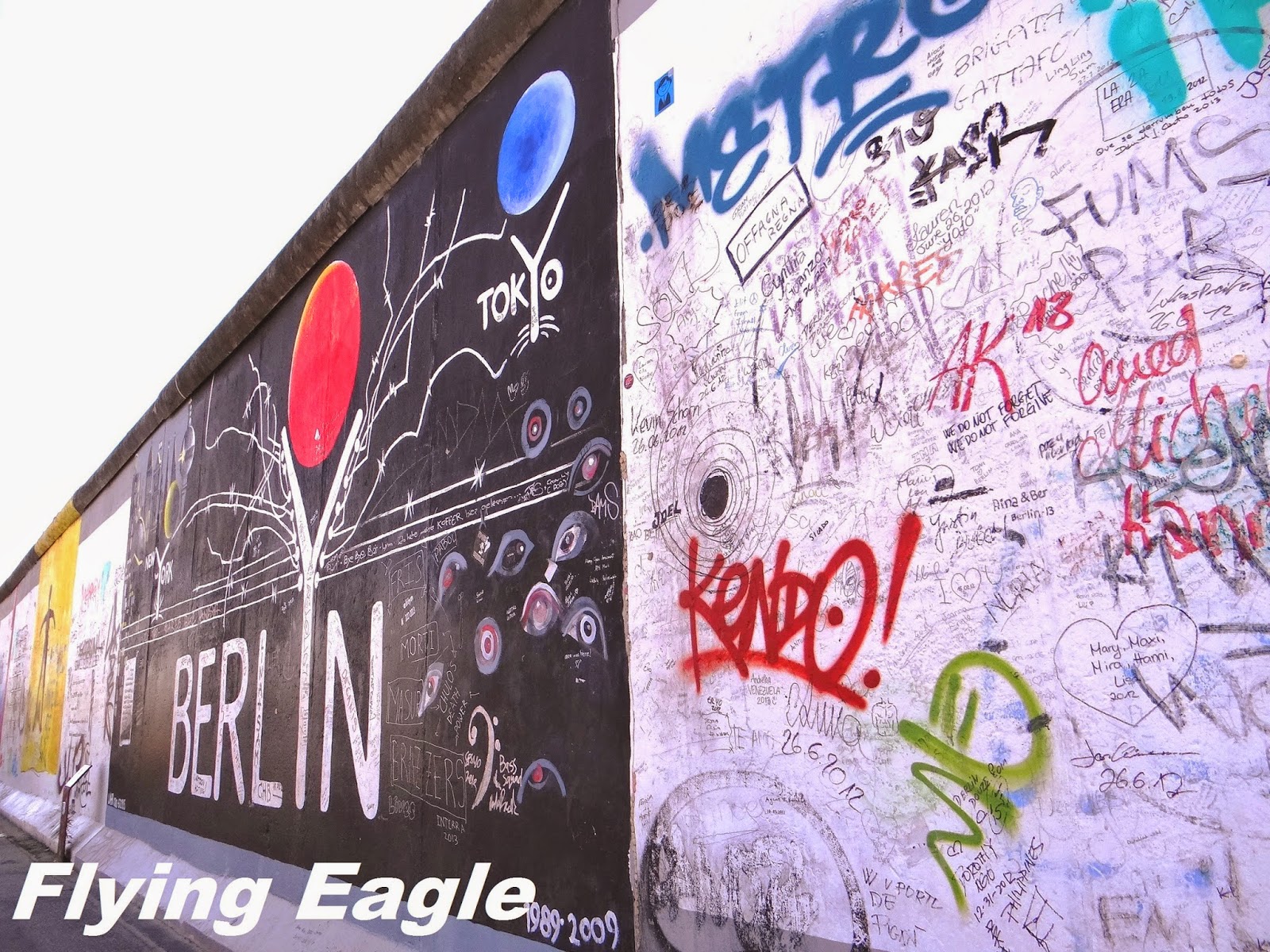 ▲柏林圍牆博物館每年有數十萬人到訪,牆上展示著不同的護照。 我們接著前往柏林圍牆,如今牆面已成了藝術家的畫布,有著各式各樣的畫作。有一幅兩個大男人親嘴的畫很引人注目,這幅畫叫做 "My God, Help Me to Survive This Deadly Love" (「求神幫助我不會被這要命的愛給毀了」),畫中人物左邊的是前蘇聯領袖布里茲涅夫,右邊的是前東德領袖昂奈克。畫作的靈感來自兩位政治人物在 1979年會面時的擁抱和親吻。在此世紀之吻前,兩國剛簽訂了合作互助條約,使雙方的關係更上層樓。畫家在柏林圍牆倒塌之後以此為題材,諷刺意味濃厚。 |