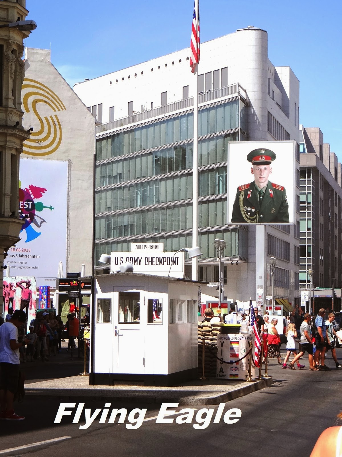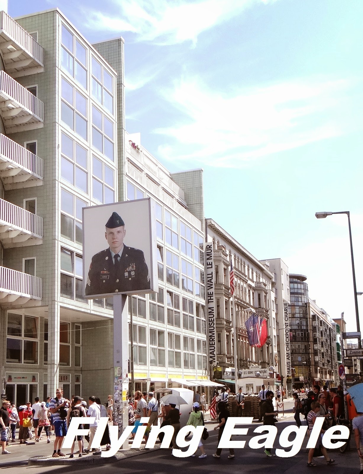 ▲柏林圍牆的查理檢查站,面向東柏林的是美軍相片。三面旗子後面便是柏林圍牆博物館。 |