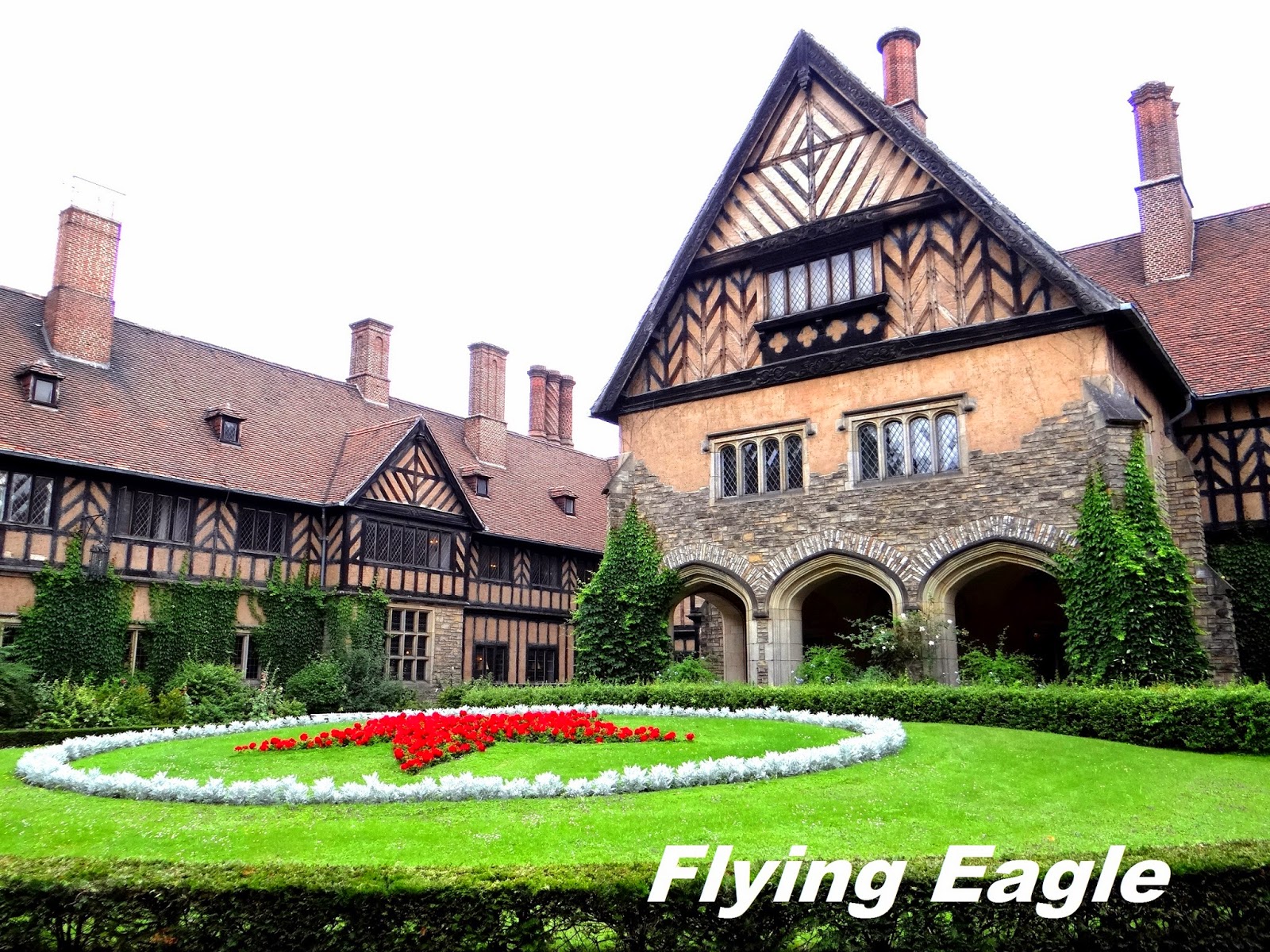 我們很快就到了塞西琳霍夫宮,這是德皇為太子和太子妃所建的住處,於1915年完工,並以太子妃的名字為名。雖然塞西琳霍夫宮擁有176個房間,但從外觀看並不覺得有那麼大,它一點都沒有宮殿的恢宏氣勢,反而較像鄉間的渡假屋。如今它是個博物館,同時也被聯合國文教組織列為世界遺產。二次大戰後德國滿目瘡痍,波茨坦的塞西琳霍夫宮因受損較輕而被選為會議的場所。當時由在德國的蘇聯軍隊負責整理會場,他們在塞西琳霍夫宮門前的綠草上以紅色植物排出個大大的紅星,有趣的是德國人一直保留至今。