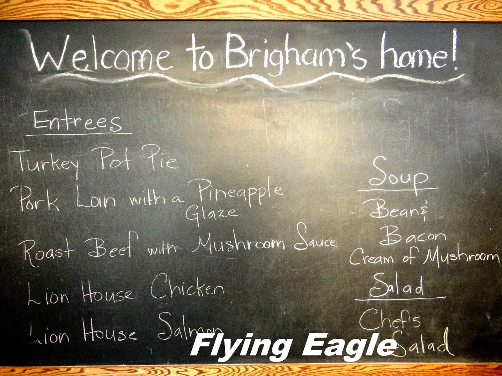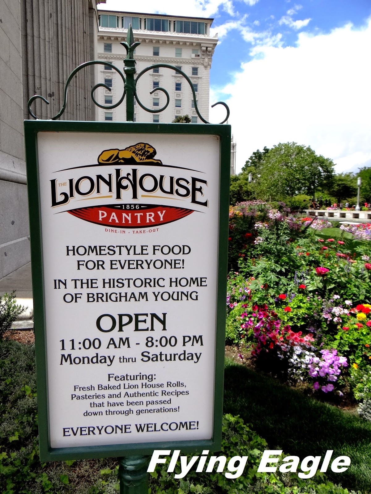 午餐時刻,我們經人推介來到由楊百翰故居改建的餐館Lion House,當初楊百翰因為家庭人口日益增多而興建了Lion House。楊百翰奉行一夫多妻制,終其一生共有55位太太,其中16位為他生了共56個孩子。家庭規模如此龐大,無怪乎要多建幾棟房子。據說這個餐館的糕餅麵包新鮮又好吃,果然在餐廳外排了長長的人龍。進去要先看好自己要點什麼,然後就像學生餐廳一樣,拿著托盤排隊等打菜的人為你服務。