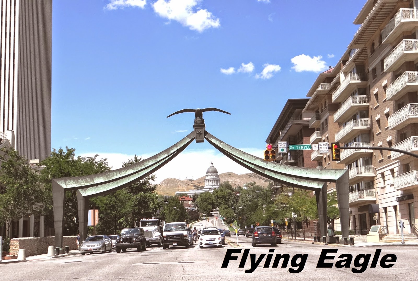 離開鹽湖城之前,必須要去照一下很特別的老鷹之門(the Eagle Gate)。我們前一天前往州府的途中就看到它,不過沒有拍照。透過這道門遠遠就望見州府,讓人有種很隆重的感覺。老鷹之門最初是楊百翰為標示自己的土地範圍,在19世紀末所設立。門頂上的老鷹展開雙翼,很切合當時的人往西部拓荒的精神。