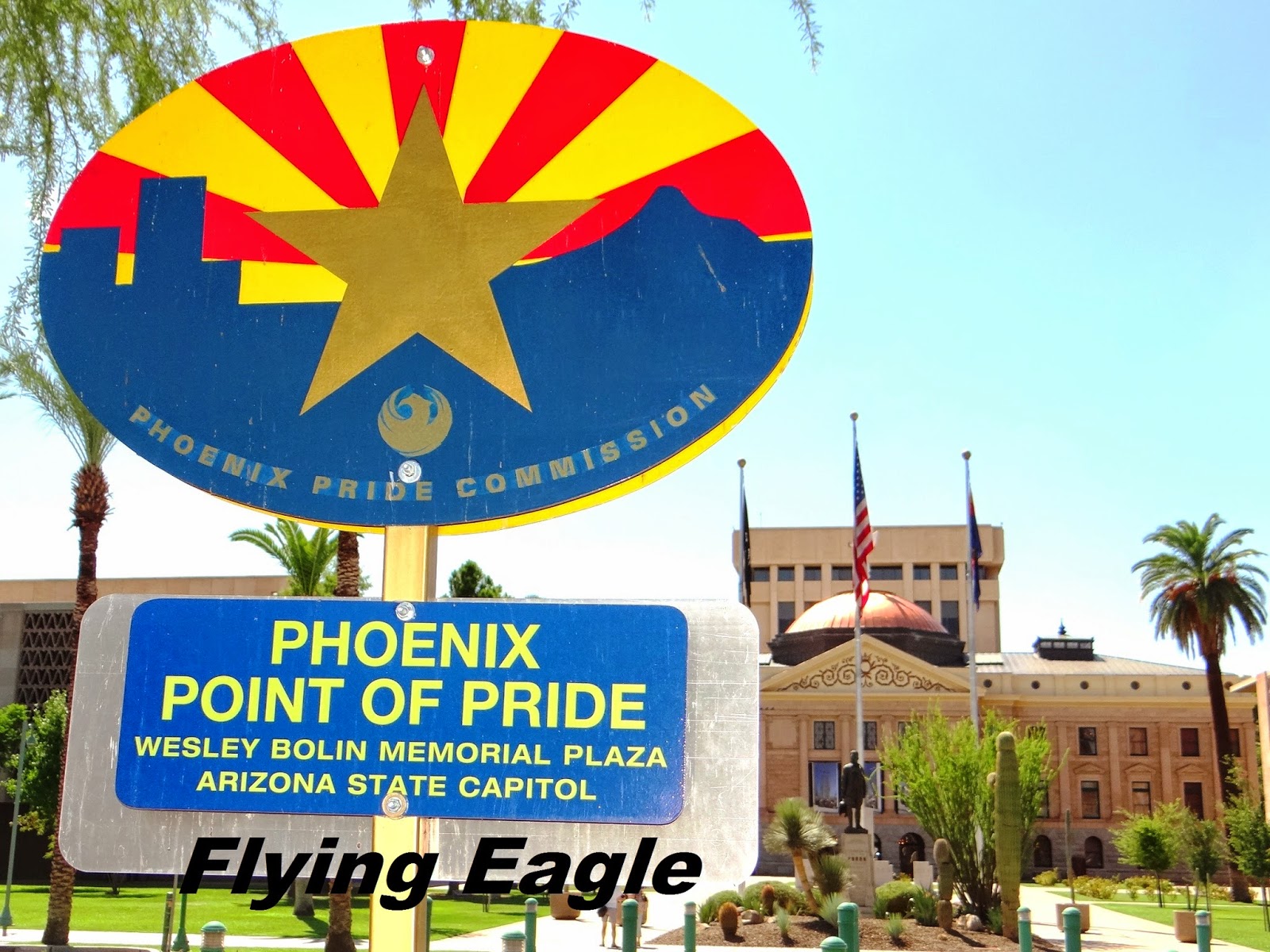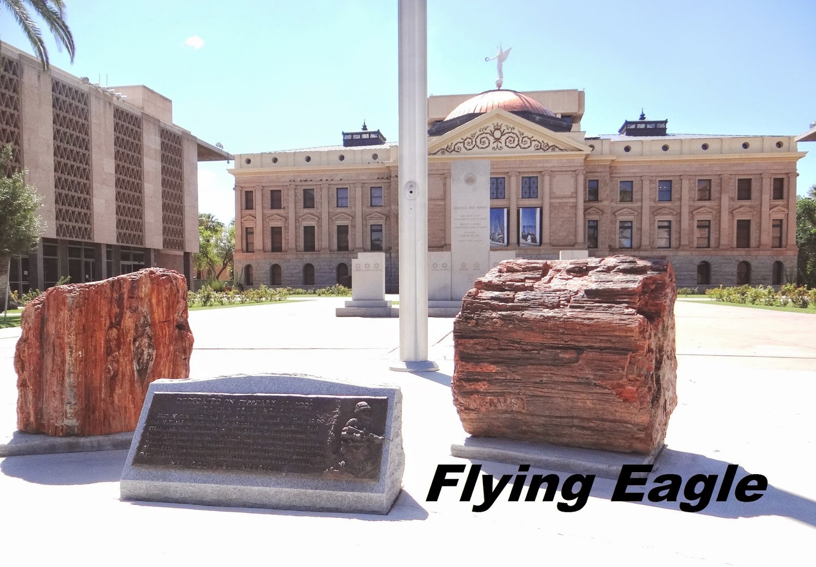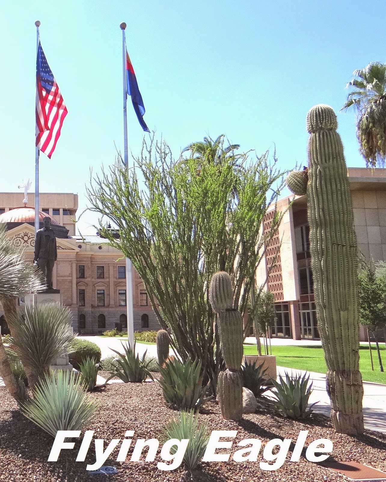 從州府廣場的擺設和紀念碑,也可增進對亞利桑那州的了解。亞利桑那州有很大部分是沙漠地形,夏季異常炎熱,也因此形形色色的仙人掌是該州常見的植物,甚至有好幾個著名景點都和仙人掌有關。在州府廣場便可看到一些不同種類的仙人掌,這是亞利桑那州的特殊地貌。除此之外,映入眼簾的是兩塊巨大的紅褐色木塊,用來紀念榮退的軍人。這兩塊樹的化石(Petrified wood),讓人想到位於該州的石化森林國家公園(Petrified Forest National Park),當然也是值得一訪的旅遊勝地。