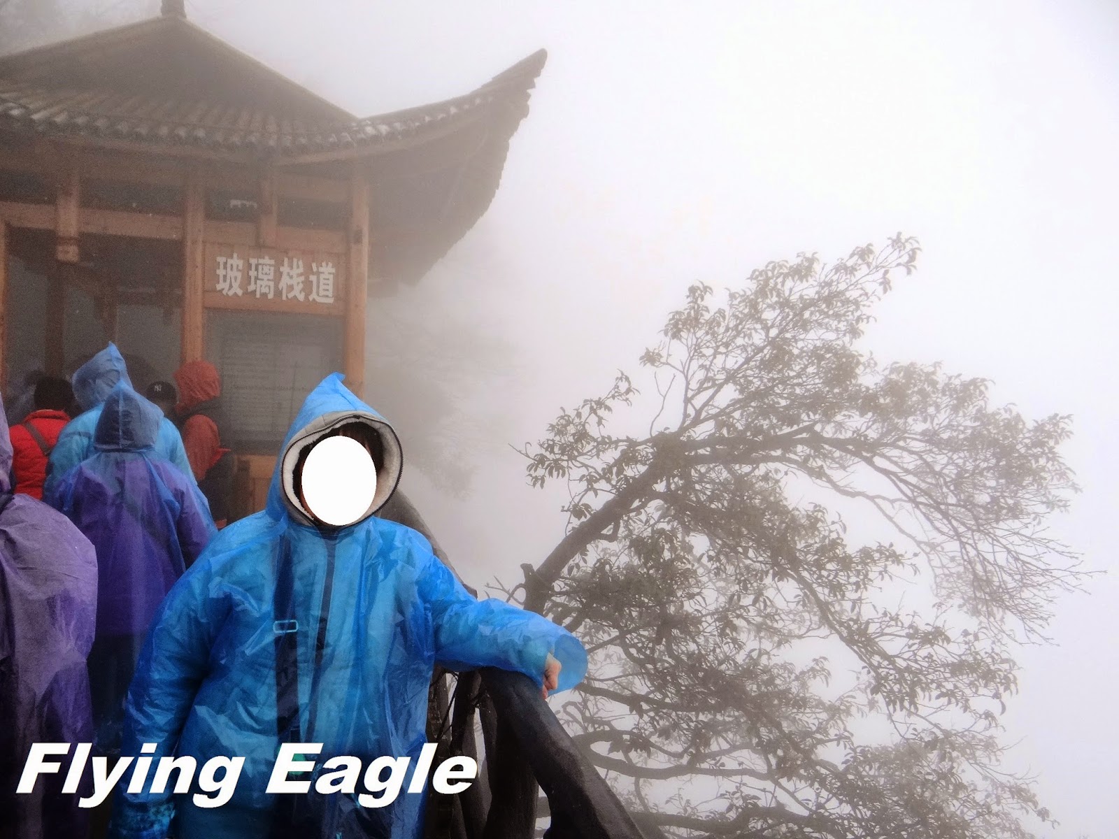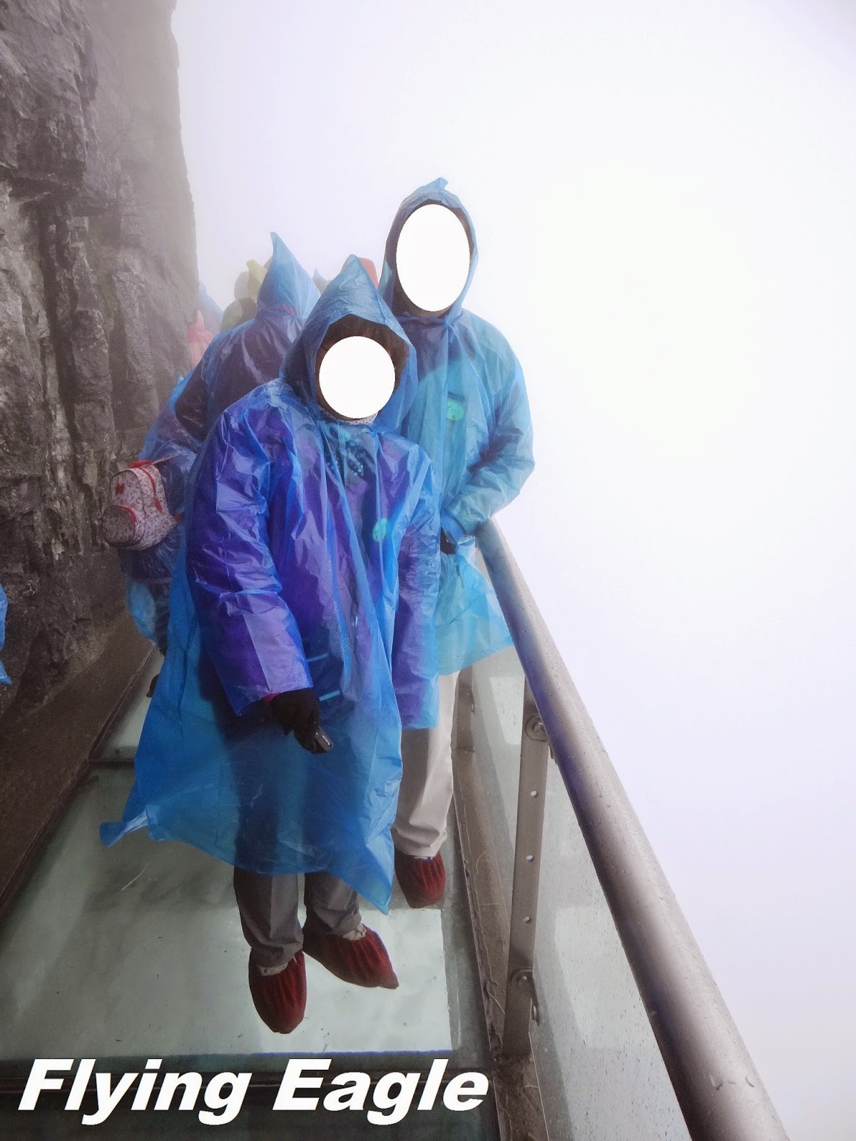 一到了山頂,大家紛紛購買雨衣,因為山上風雨交加,雨傘根本撐不起來。接著要前往玻璃棧道,棧道沿山而建,除可觀賞四周美麗的山景之外,也可看到棧道底下的風光。可惜天候不佳,看到的風光很有限。