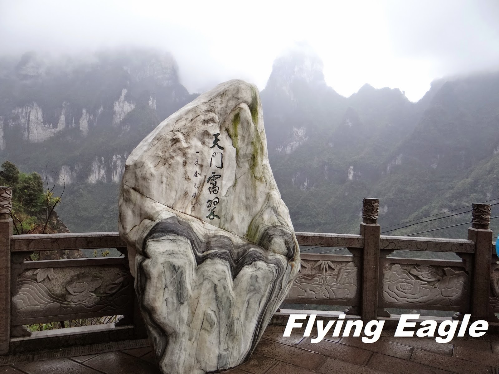 在山頂參觀完後再搭纜車到山腰,這裡有塊大石頭上面題了字,看了老半天也猜不到第4個字是什麼,後來才知道是天門靄翠。我們在山腰轉搭環保車,體驗蜿蜒的通天大道99彎。這條通天大道據說是中國10大險峻山路之一,全長不到11公里,海拔卻從200公尺急升至1300公尺。從高處俯瞰這條通天大道宛如一條蛇,頗為壯觀。