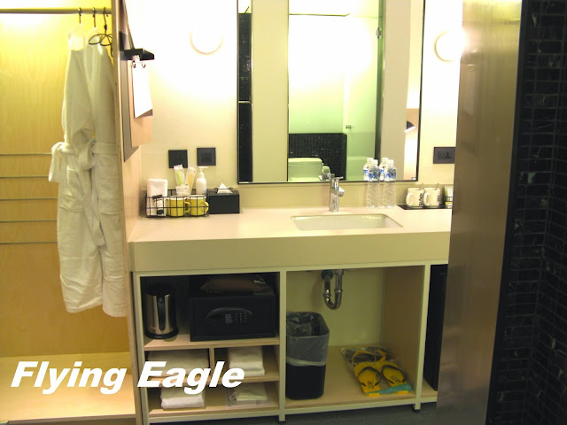 The room was bright. While not spacious, it did have some thoughtful designs. There were two layers of curtains to block the sunshine. The shower was separated from the toilet and the sink. There was plenty of counter space right next to the sink for toiletries and other things. I was also delighted to see two thick robes in a not-too-small closet. In Taipei, many boutique hotels simply do not provide a closet, so Amba is an exception to the norm. Our room was close to the elevator, but noise was not a problem at all.