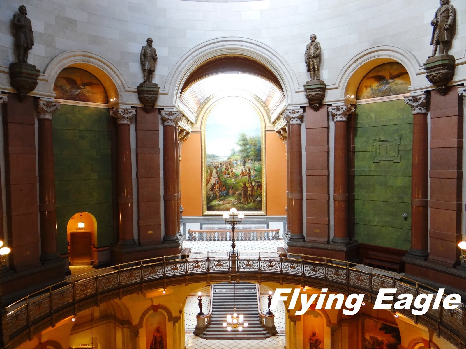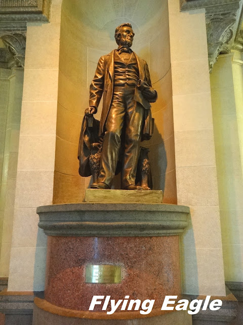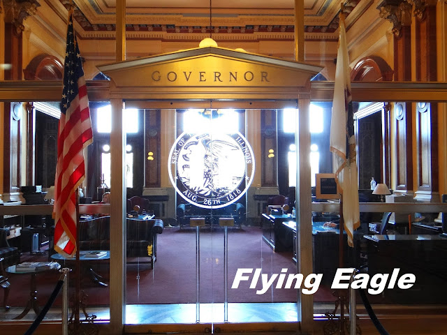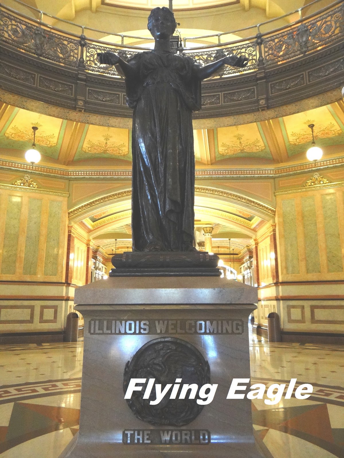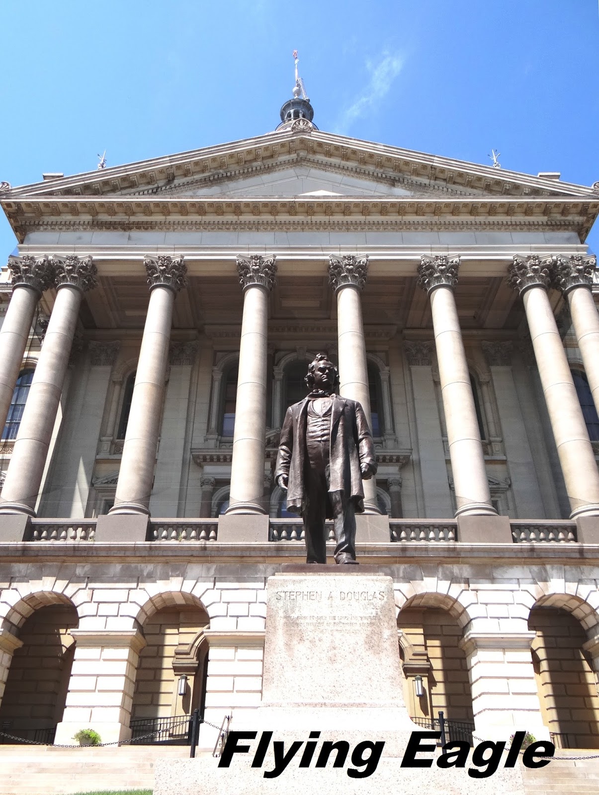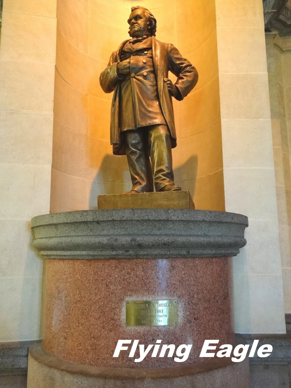 伊利諾州府的一大特色是雕像特別多,從裡到外都是。建築內再一次看到林肯的雕像,也再一次他的政治宿敵道格拉斯的塑像和他分庭抗禮。有趣的是林肯素以身材高著稱,身高6呎4吋(193公分);而道格拉斯被稱為「小巨人」,因其人矮小,僅5呎4吋高(162.5公分),但個性強悍。兩位政治人物一高一矮,而州府裡依真人尺寸打造的銅像也清楚表明了這點。另外還有一座女性的雕像代表著伊利諾州,歡迎來自世界各地的遊客。我們的導覽員在解說完畢後,還特別請我們到辦公室裡,拿小圖釘在世界地圖上標示出我們的國家並拍照留念。這也是我們走訪各個州府以來,首次遇到的特殊待遇。