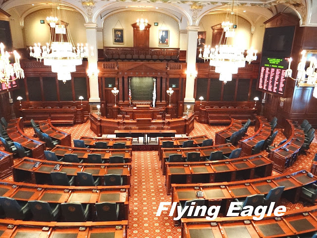 我們一進州府,剛好碰上一個導覽團正要開始。導覽員帶我們重點參觀這花了20年才打造完畢的州府建築。眾議會比參議會華麗,連水晶吊燈和天花板上的雕飾都十分考究,看得出來當年必然所費不貲。參議會是歐巴馬總統在政壇初試啼聲的所在,導覽員還特別指出歐巴馬昔日的座位。
