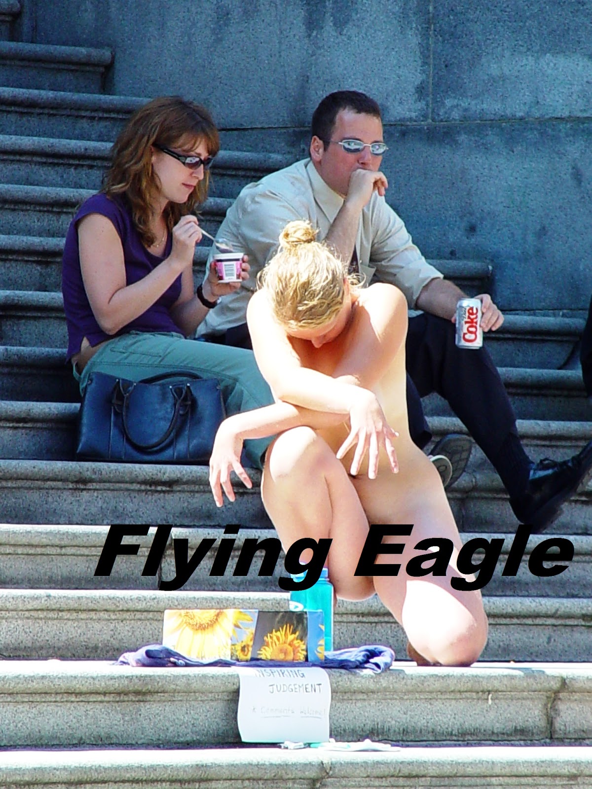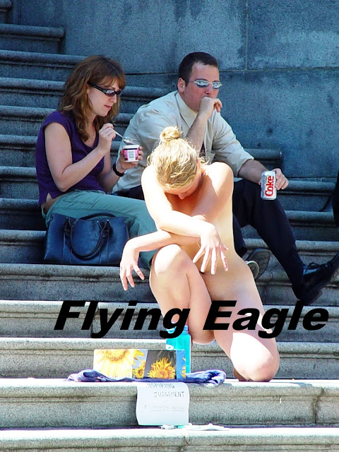 此時有位年輕的金髮女子出現在台階上,全身赤裸。她不停擺出不同的姿勢,時而站立,時而踡伏。我們在北美生活過若干年,從未見過有人在大庭廣眾一絲不掛,所以有些驚訝。我們不曉得她此舉的意圖,或許她想用自己的軀體來與羅丹的雕塑相互呼應。而更有趣的是,周圍的人或閱讀、或談天,很少人注目於此女身上,想來是尊重他人的表達方式吧!我就用這幾張以長鏡頭拍得的畫面,來述說旅途中的小插曲!