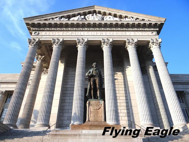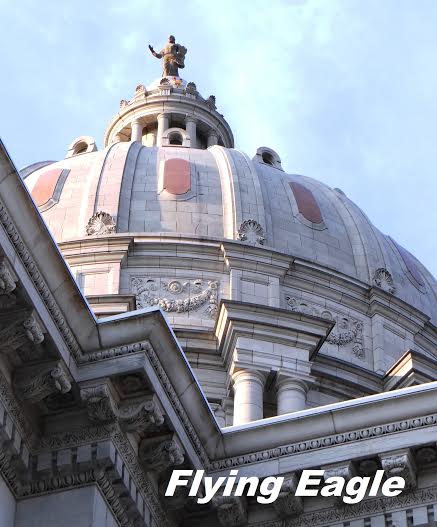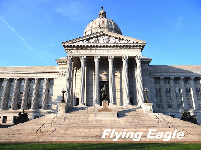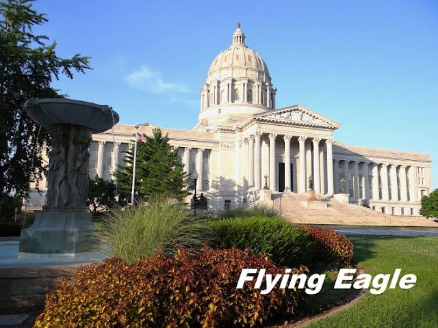 密蘇里州位於美國中西部,首府是傑弗遜市,顧名思義該市是為紀念開國元勛傑弗遜(Thomas Jefferson)而得名。傑弗遜是美國獨立宣言的起草人,後來並擔任美國第3任總統。州府建築和多數的州府一樣,仿傚華府的國會山莊採圓頂設計。但整體的設計風格除了讓人想到華府的國會外,還很有希臘羅馬神殿的味道。州府的正面有些像羅馬神廟,氣派寬廣的階梯逐漸往上收窄,階梯的間距頗大,爬上爬下覺得很陡。階梯前的草地兩側各有一個羅馬式的噴水池,潺潺的水由頂部4個方向緩緩流出。