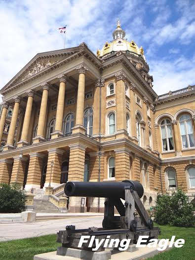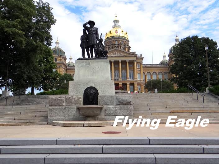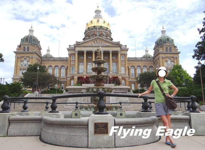 我們到達愛荷華州府後,對於它佔地之廣和建築造型之特別頗為驚訝。很多州府都仿傚華府的國會山莊,但都是一個圓頂,而愛荷華則是一個金色大圓頂居中,四個綠色較小的圓頂分立四角。州府四周還有為數不少的雕像和紀念碑,以農業州來說,這樣的氣派的確超乎想像。