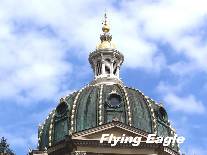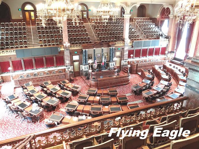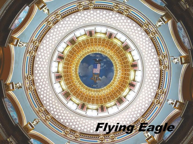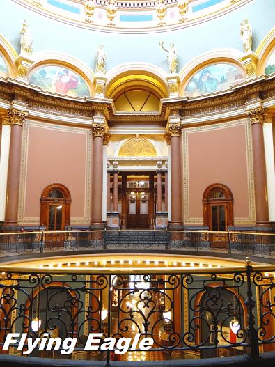 我們在各個圓頂設計的州府內,喜歡抬頭仰望圓頂的最高處,也常有意外的收穫。愛荷華州府的圓頂頗具特色,紀念南北戰爭的徽章標誌被高高懸掛,標誌旁邊並繪有藍天白雲。站在中庭,可以把上下樓層的景觀一覽無遺。圓頂下的二樓有壁畫描繪先民拓荒史,12尊金像代表人類文明的不同範疇,如歷史、科學、法律、文學等。參眾兩議會也位於二樓,我們到訪時議場並不對外開放,但從樓上的旁聽席可一窺全貌。