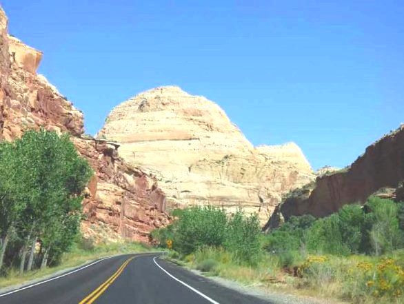 圓頂礁國家公園位於猶他州的中南部,這裡的特色景致是白色、橘紅色或磚紅色的砂岩。有些白色砂岩頂端呈圓形,狀似華府國會建築的白圓頂;而岩石對於早期的交通是一大障礙,有如海底的礁石影響船行,所以這個國家公園就有了圓頂礁這名字。圓頂礁的名氣不若猶他州其他的國家公園響亮,原因在於它1971年才成為國家公園,歷史最短。往來圓頂礁完全仰賴一條蜿蜒的小公路,交通不太便利,公園內的設施亦不十分完備,所以我和我先生將它排名猶他州5個國家公園的第5名。雖然如此,圓頂礁仍有其優點。它的出名景點多位於路旁,可以近距離觀賞,我們的相片便多是在路邊拍攝。此外這裡的遊客也較少,予人一種遺世獨立的感受。