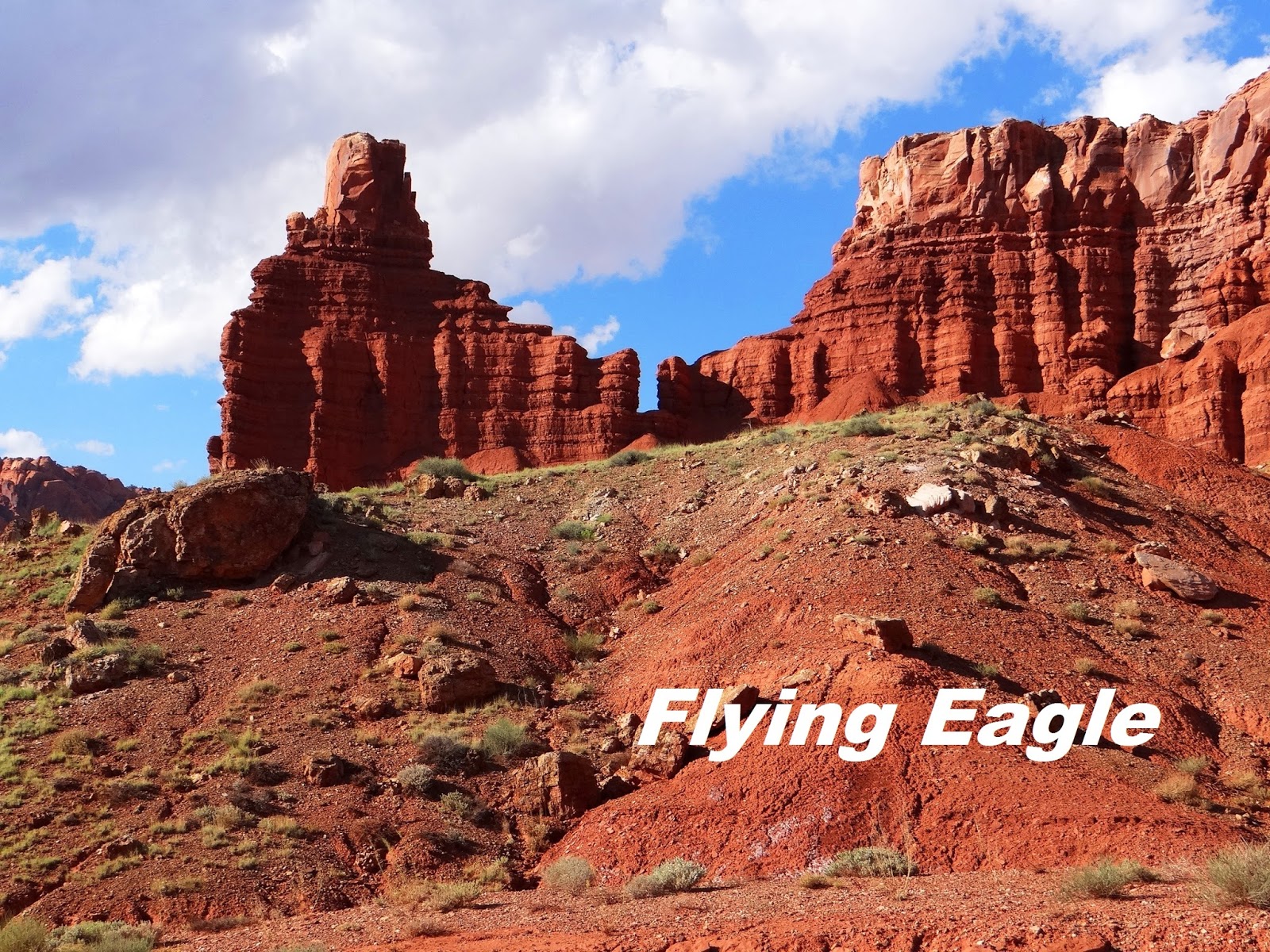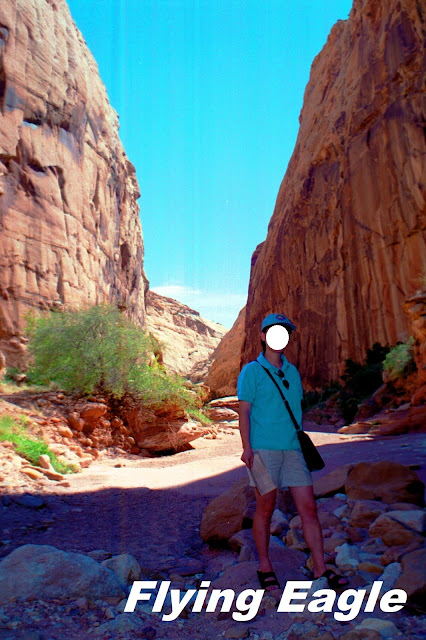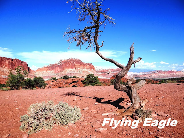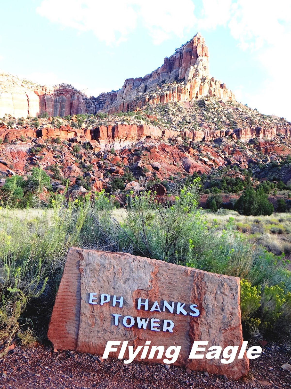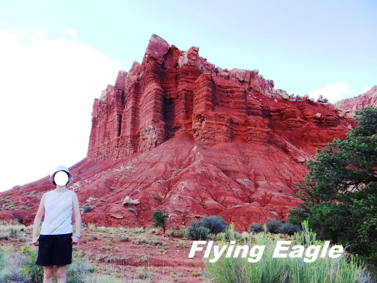 我們沿著從遊客中心出發的Scenic Drive,開車前往圓頂峽谷(Capitol Gorge)。柏油路的盡頭是「漢斯高塔」(Eph Hanks Tower),這是攀岩人士很愛攀爬的山岩。再繼續往前便是未鋪設柏油的泥巴路,這段路常因暴洪而不能通行。我們2001年曾到圓頂峽谷一遊,在2014年則因封路,敗興而歸。此外,公園裡還有偏遠的一區叫Cathedral Valley,有一些像高聳大教堂的美麗山岩,不過我們因行程緊湊,只好捨棄。離開公園時已是黃昏,在紅霞映照下幾座「國會圓頂」更顯嫵媚,順手拍下為此行譜下完美的休止符。