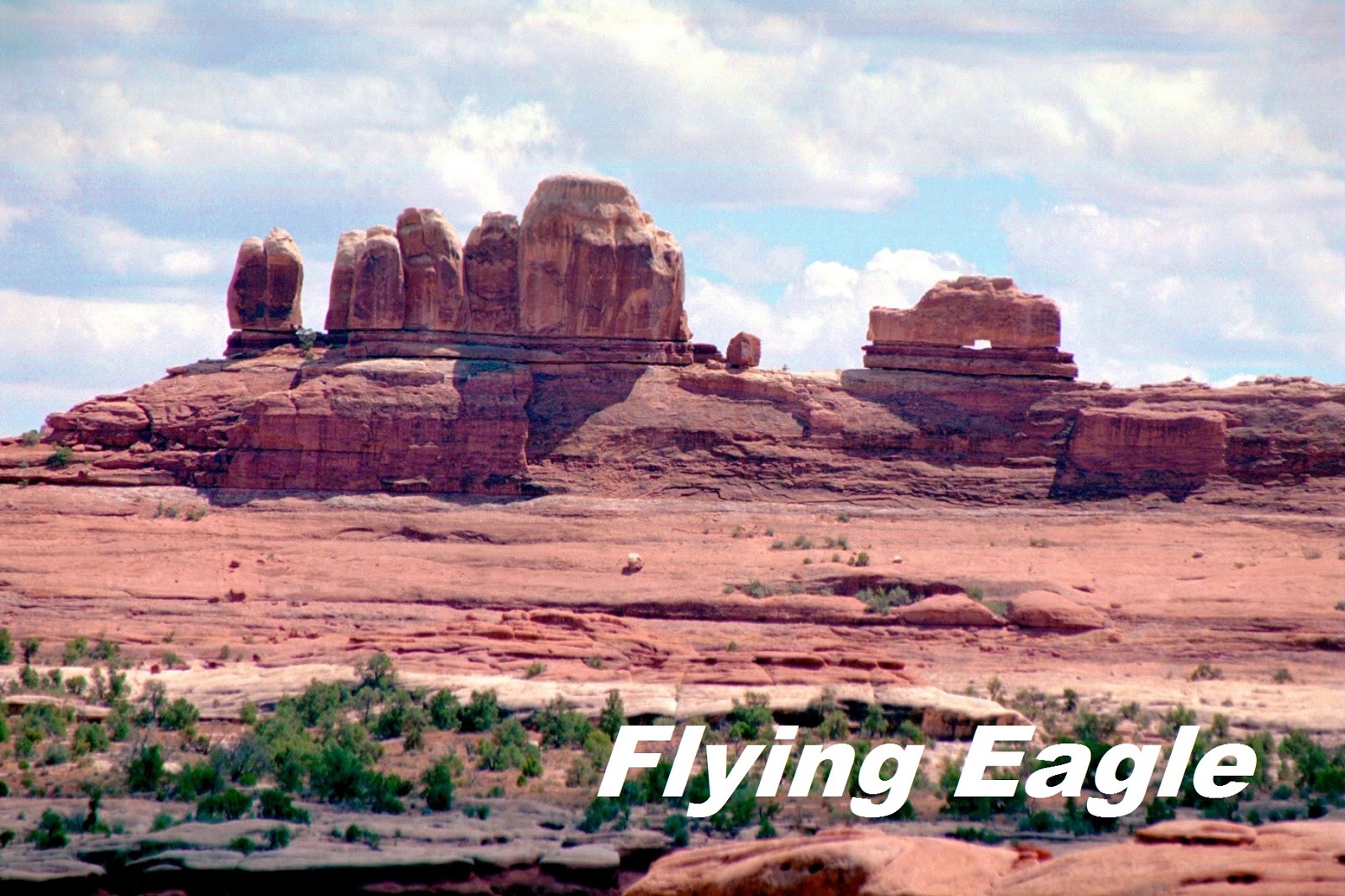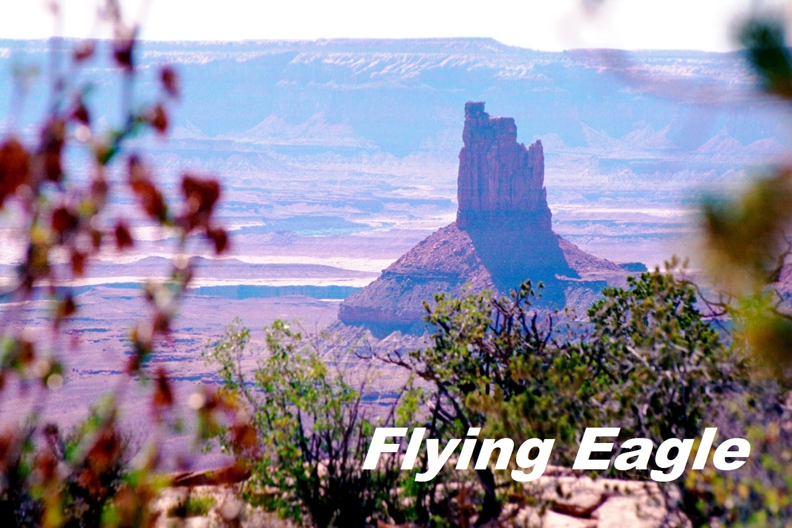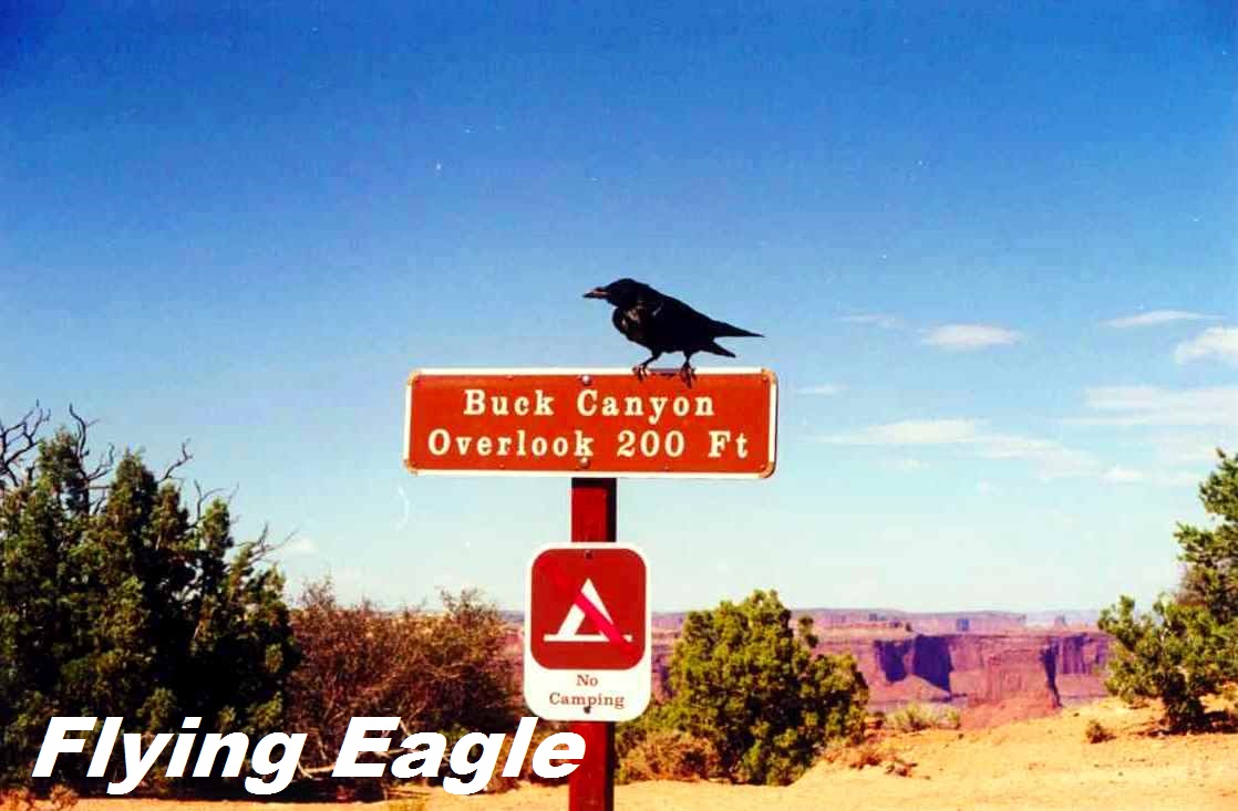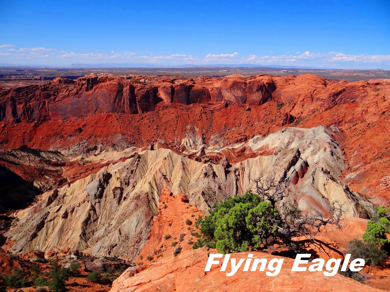我們從公園北面的入口進公園,來到了天空之島。開車走到柏油路的盡頭便是壯觀眺望點(Grand View Point Overlook)。這個眺望點可說是位於公園的中心,它左望綠河、右看科羅拉多河切割出來的峽谷,往南則可遠眺另外兩區。由高處俯視,只見到彎彎曲曲的峽谷,但細看才會看到峽谷之中另有名堂。原來被河流切割出來的空間,有著一排排的石壁和一根根的石柱,而且上頭的紋路清晰可見。接著來到公羊峽谷眺望點(Buck Canyon Overlook),這裡似乎烏鴉特別多,我們兩度造訪都在此看到。烏鴉孤伶伶地佇立在乾枯的枝頭,為沓無人跡的曠野平添幾許荒涼。