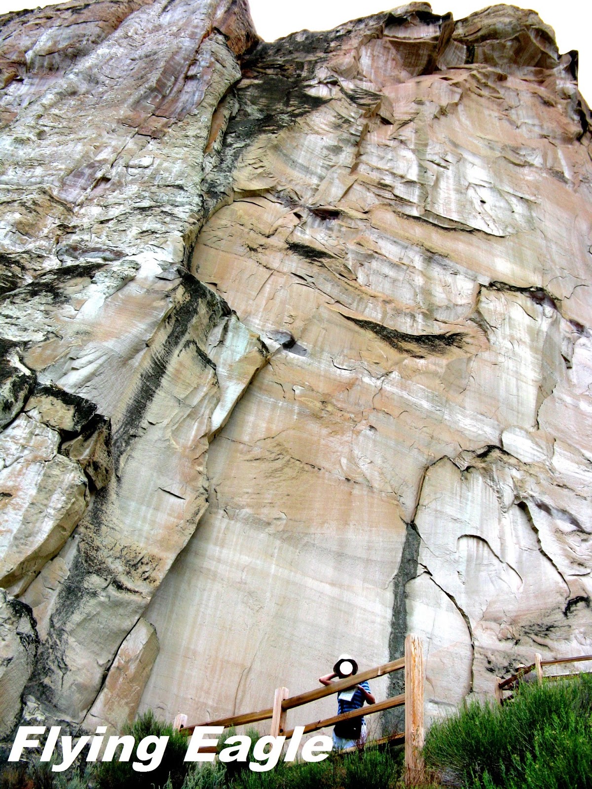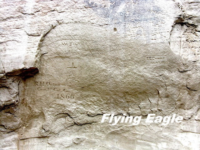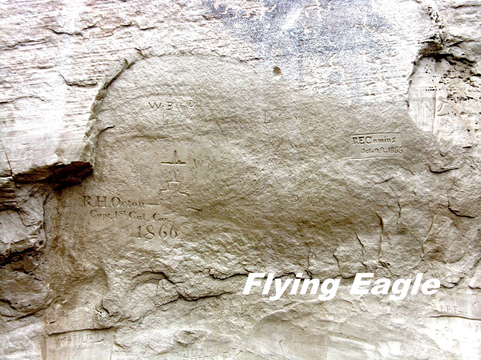 園區有2條步道,如果能在園區停留較長時間,可以走Headland Trail。這條步道較為費力,直通山壁頂端,需要花至少1.5小時。如果像我們一樣時間有限,可以走既短又省力的石刻步道(Inscription Trail)。這條環形步道只有0.5哩長,不到1小時便可回到起點。遊客中心備有圖文並茂的導覽手冊供遊客使用,只要用畢歸還即可。沿途的重點景觀都已標出號碼,遊客可對照手冊的說明詳加了解。走上步道不久,我們就看到位於山壁下方的水池,這個歷史悠久的水池,過往曾是沙漠旅人莫大的慰藉。迄今水池仍未乾涸,繼續解決野生動物飲水之需。過了水池之後就開始看到石壁上的刻字,有英文也有西班牙文,有的字體十分工整,彷彿像蓋章印上去的一般,刻工了得。