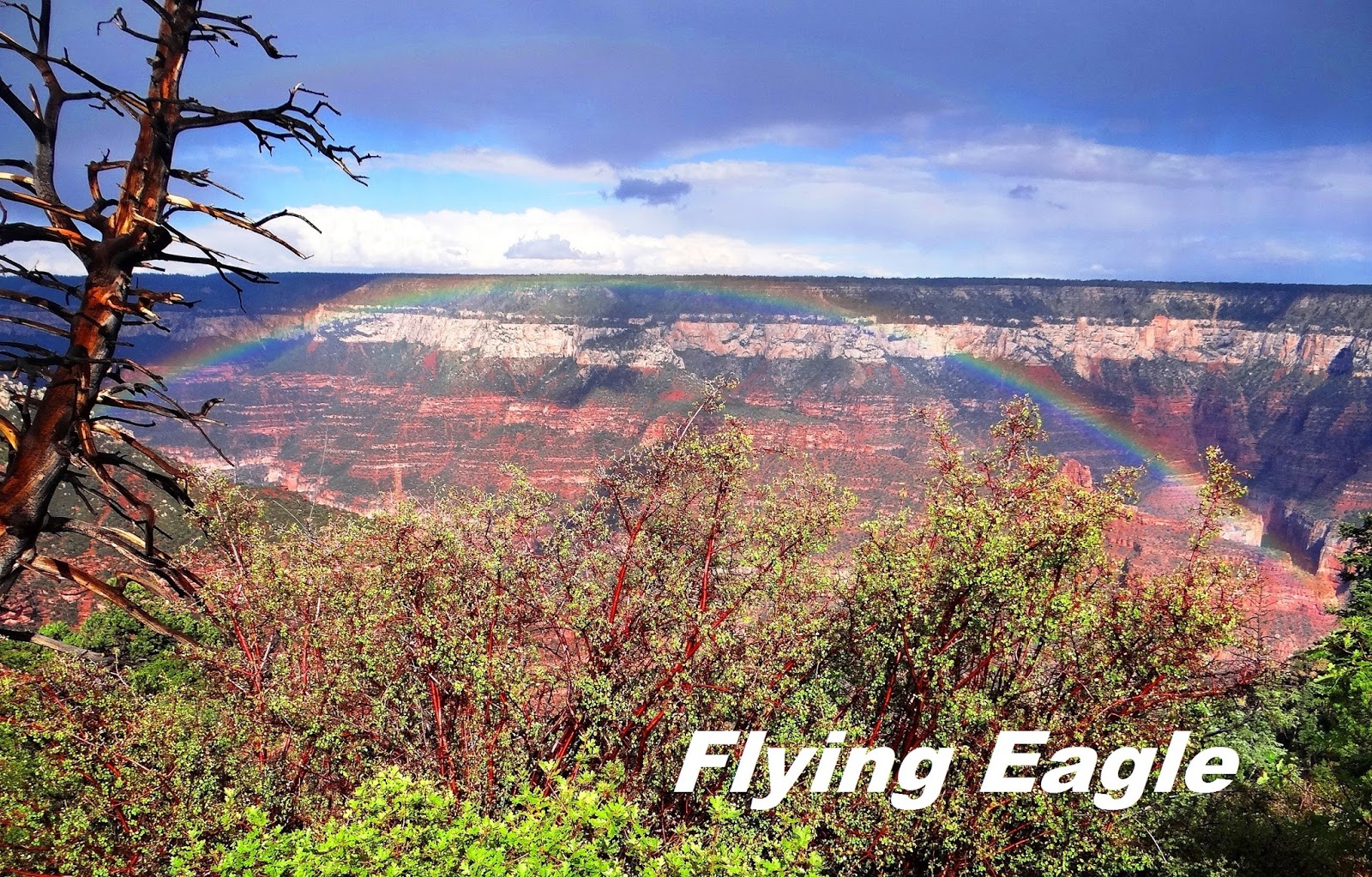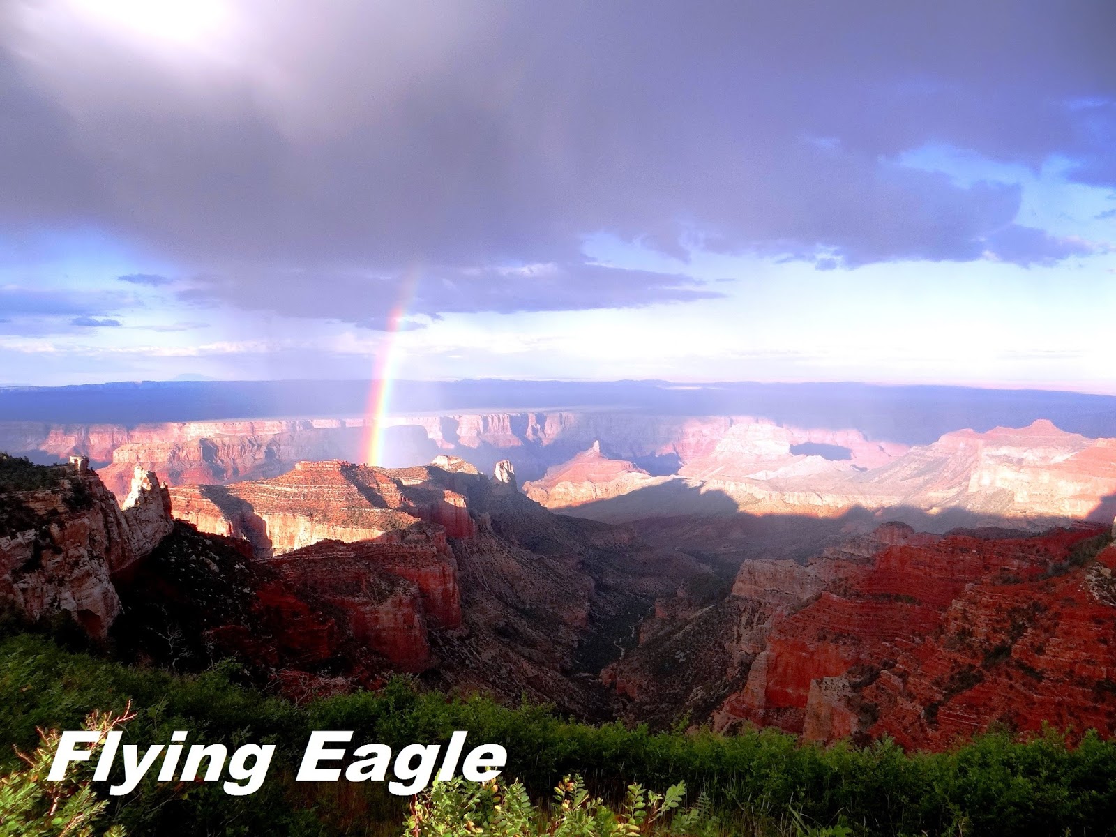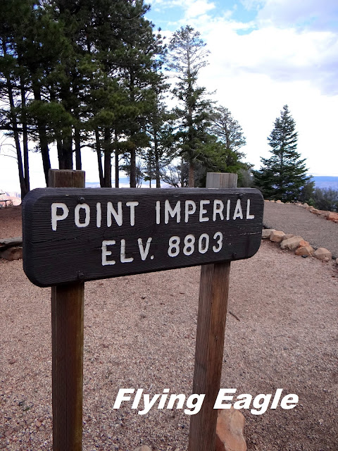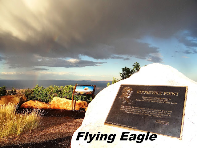 雖然北緣的設施不如南緣,但仍有不少步道,我們先走了光明天使點步道(Bright Angel Point Trail),這條步道就在Grand Canyon Lodge旁邊,簡單易行,來回不到半小時。在大雨過後天際出現了彩虹,彷彿上帝為峽谷繫上彩色的髮帶。就這樣,彩虹橫跨峽谷的美麗景象一路伴隨我們,一掃之前等待雨停帶來的鬱悶。之後我們去了帝王點(Point Imperial),它高近9千呎,是整個大峽谷最高的觀景點。從帝王點遠望,只見紅白交錯的峽谷有綠色的區塊妝點其間,獨自聳立在最高處的是海頓山(Mt. Hayden)。