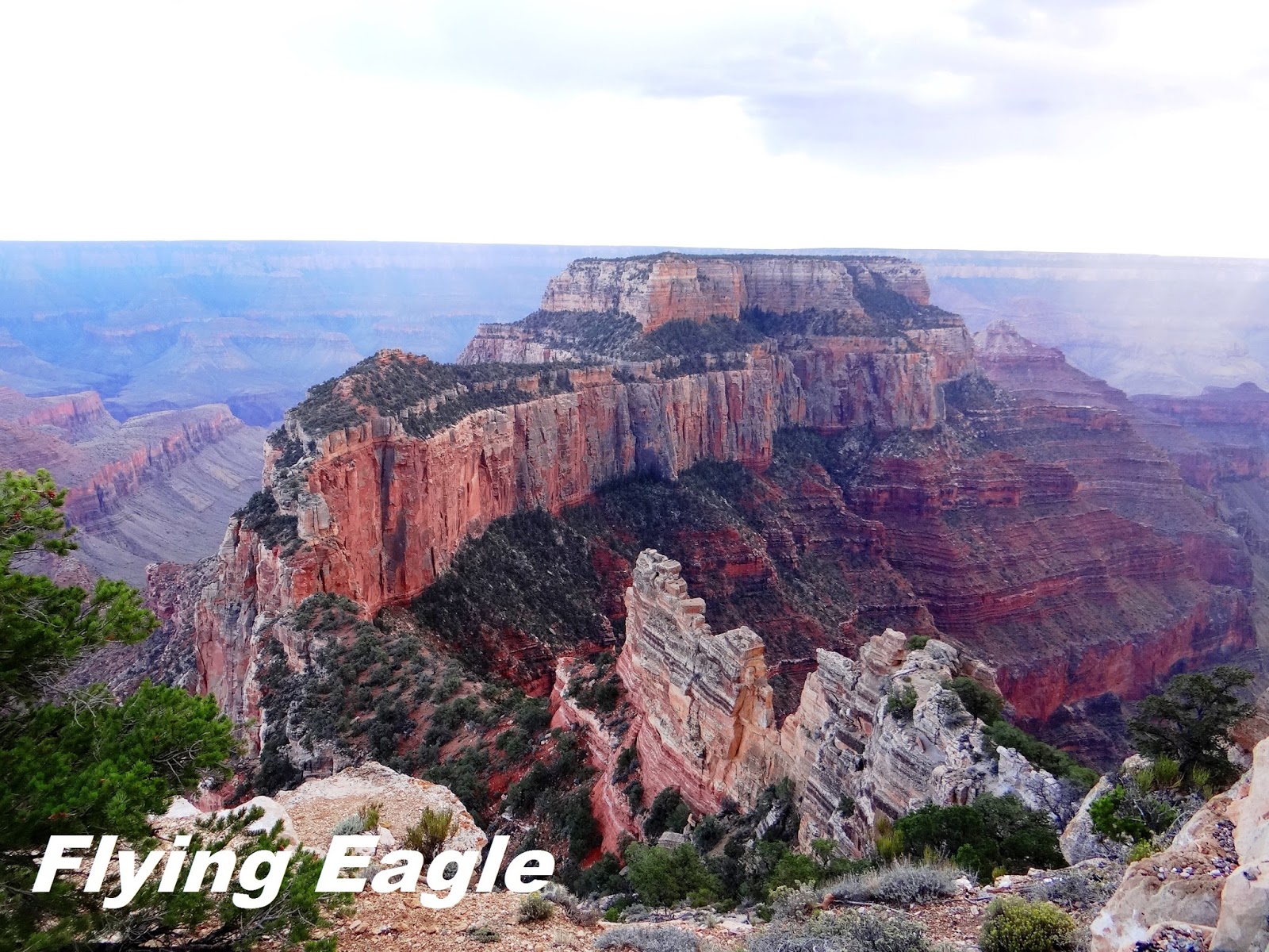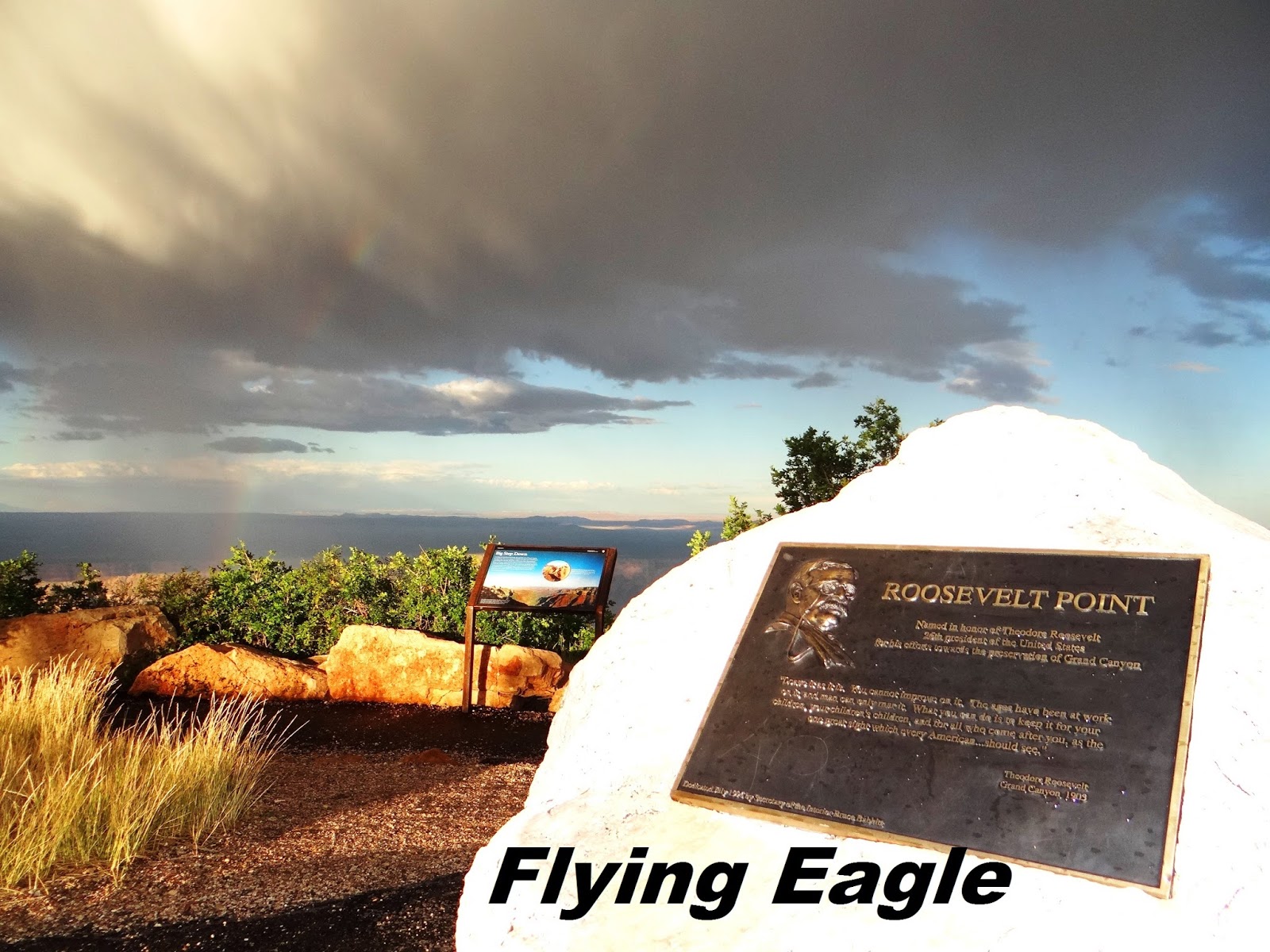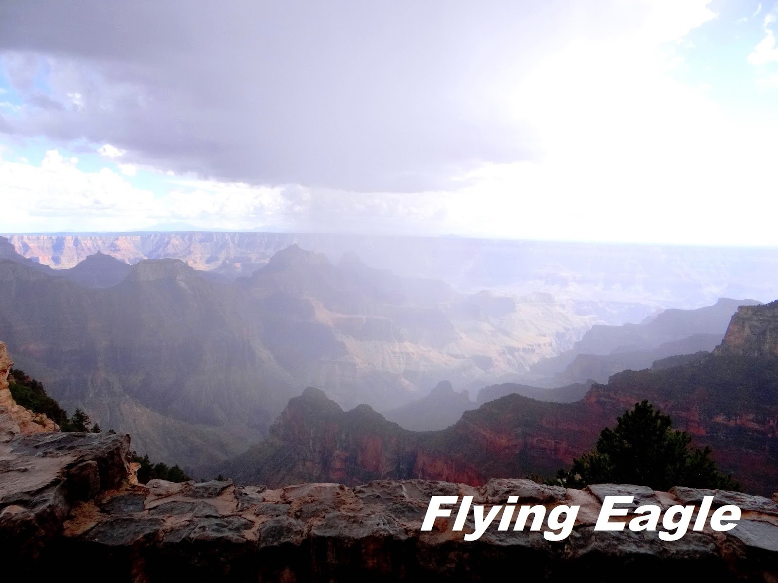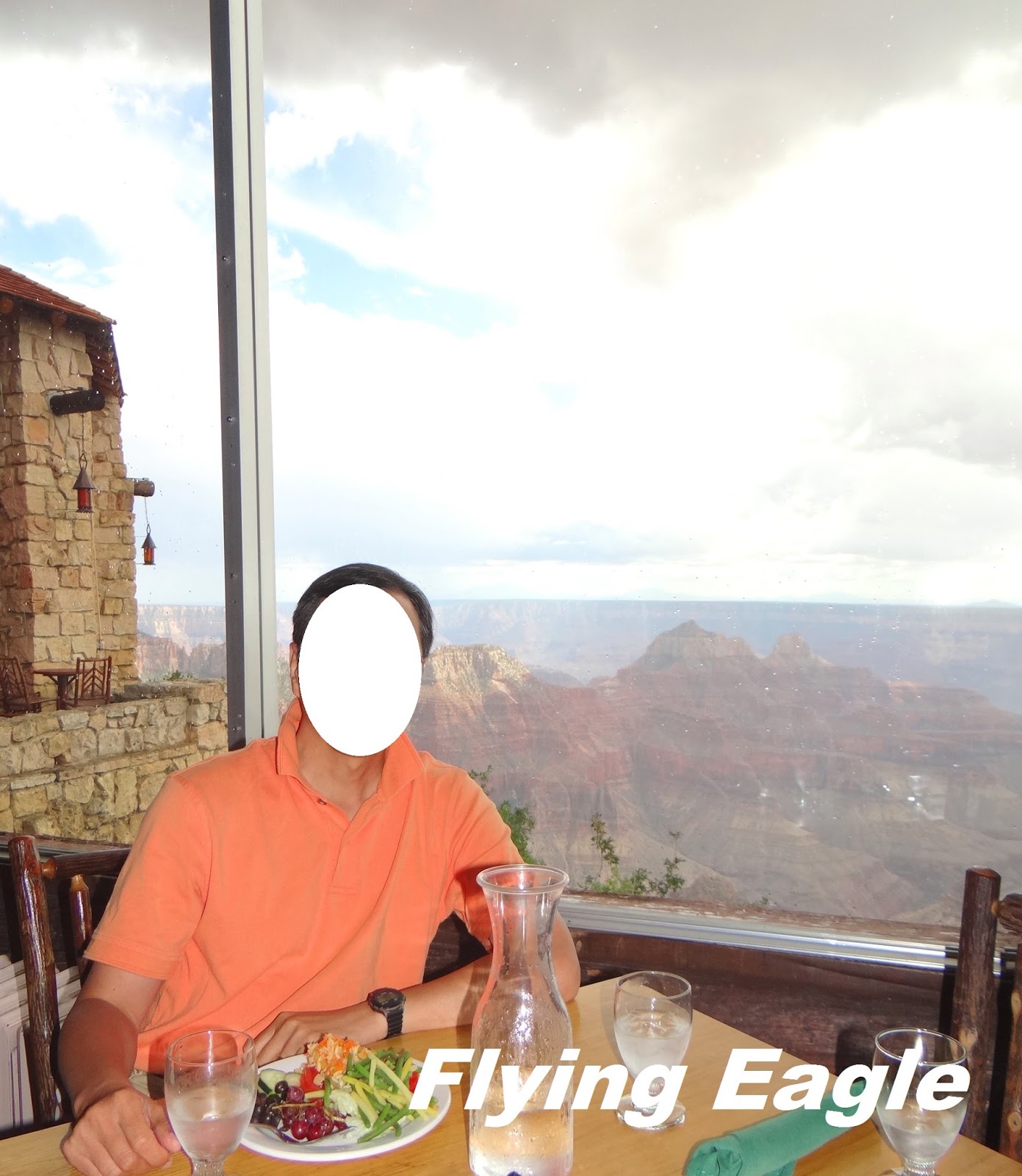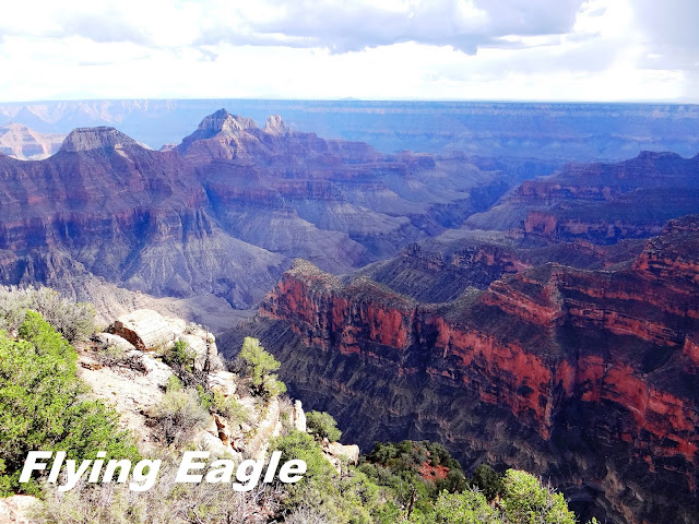 2014年的這一次,我們到時已是下午,索性在Grand Canyon Lodge用餐,據說這裡是北緣最佳的觀景點。我們的座位臨窗,一邊用餐還可一邊欣賞峽谷的美景,實在是一大樂事!這天天氣不好,很快就烏雲密布,雷聲隆隆,下起大雨。我們在Lodge裡耐心等候,趁著雨勢稍歇,趕緊跑出去拍了一些峽谷的畫面。